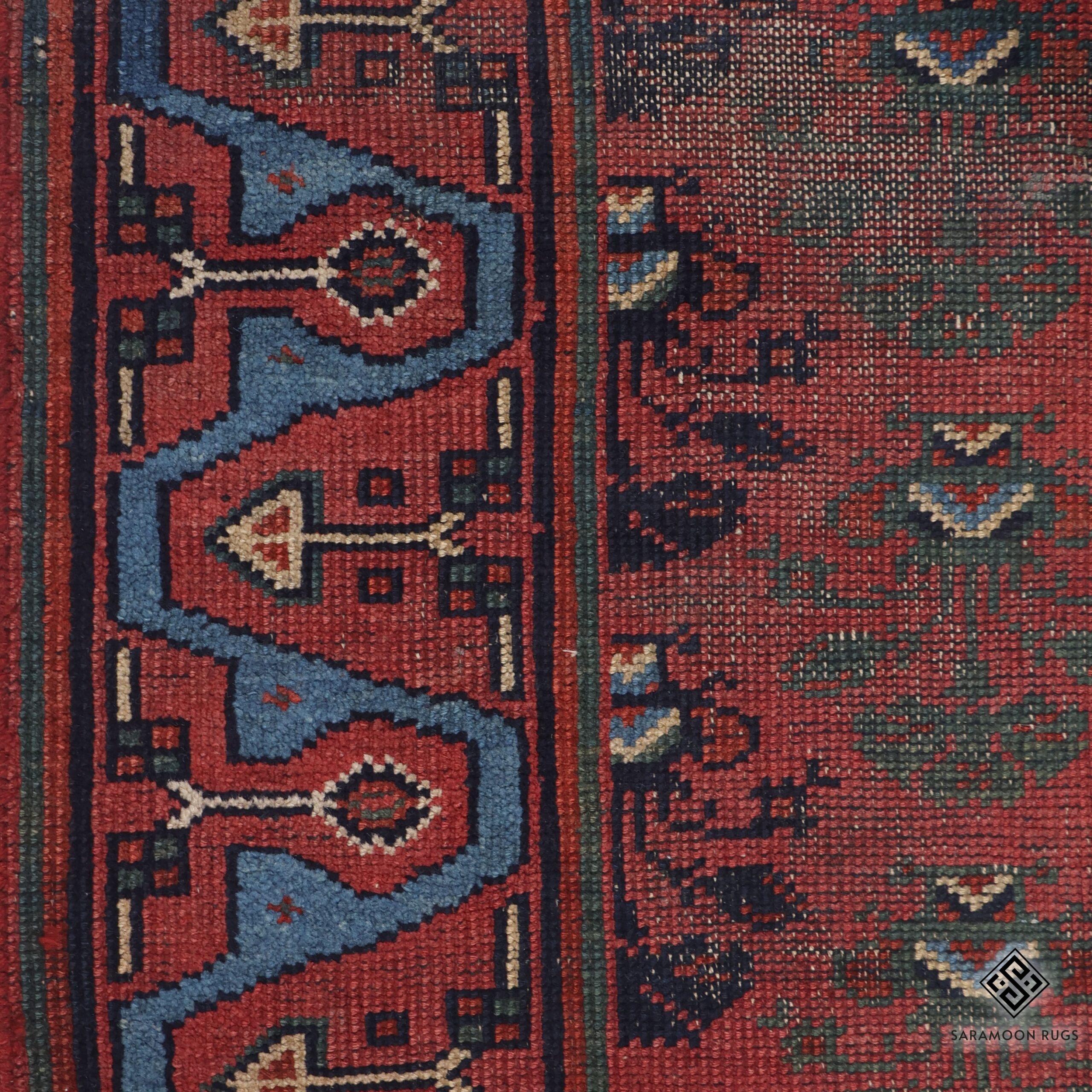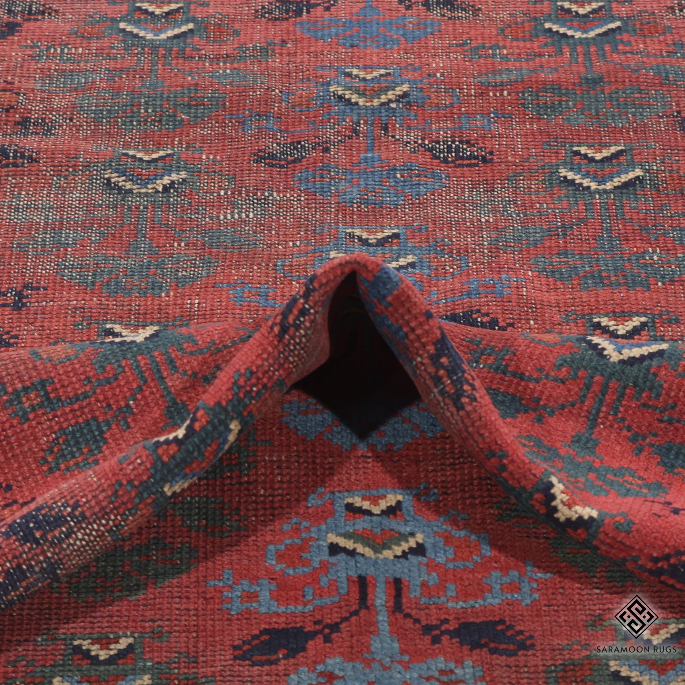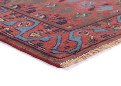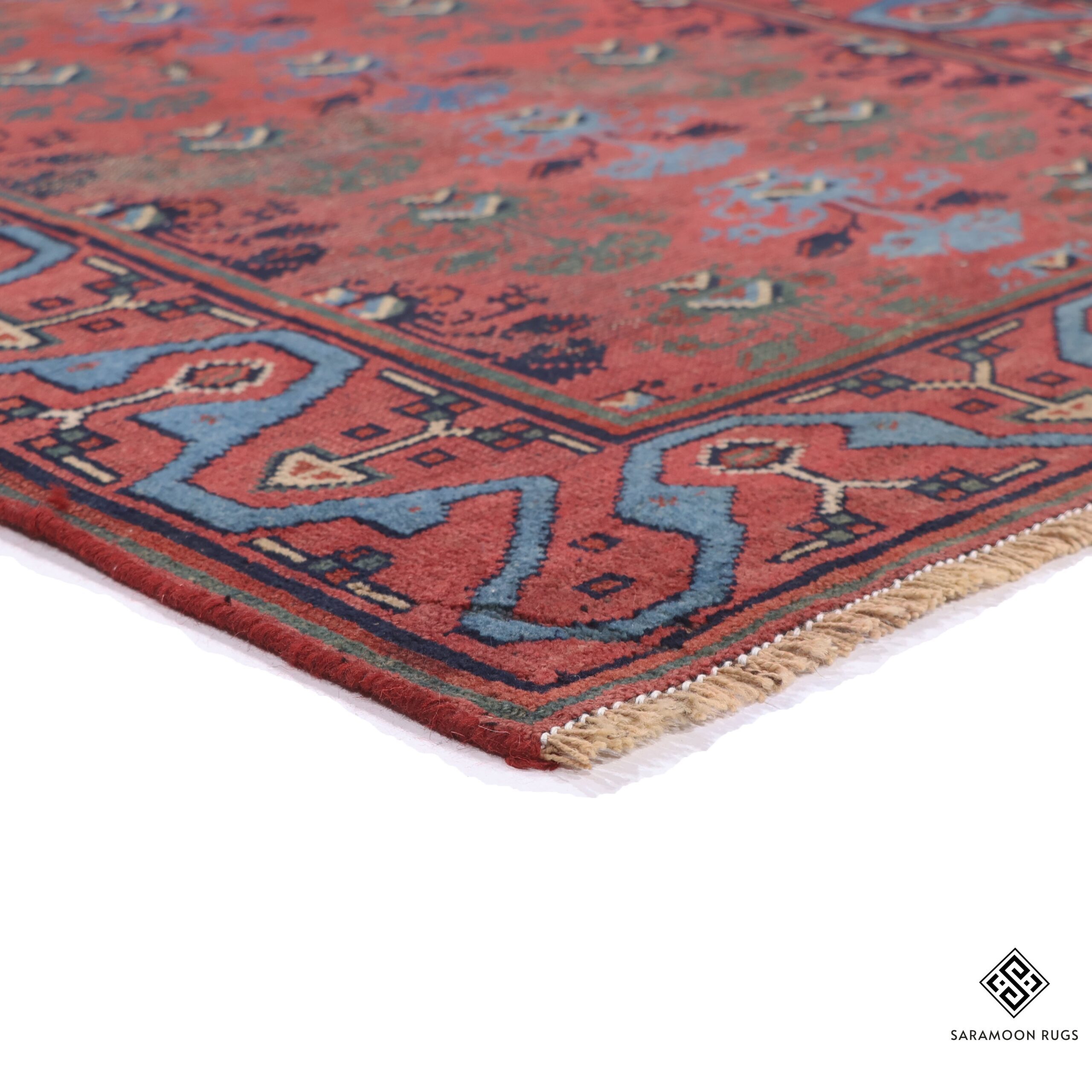 The design presents a mesmerizing field of repeating boteh motifs set against a rich terracotta red background, creating a rhythmic pattern that flows throughout the piece. The border displays a sophisticated geometric design with distinctive blue triangular forms and arrow-like elements, framed by subtle guard borders. The interplay between the deep red ground and the steel blue border creates a striking visual contrast, while touches of forest green and ivory add depth and sophistication to the overall palette.