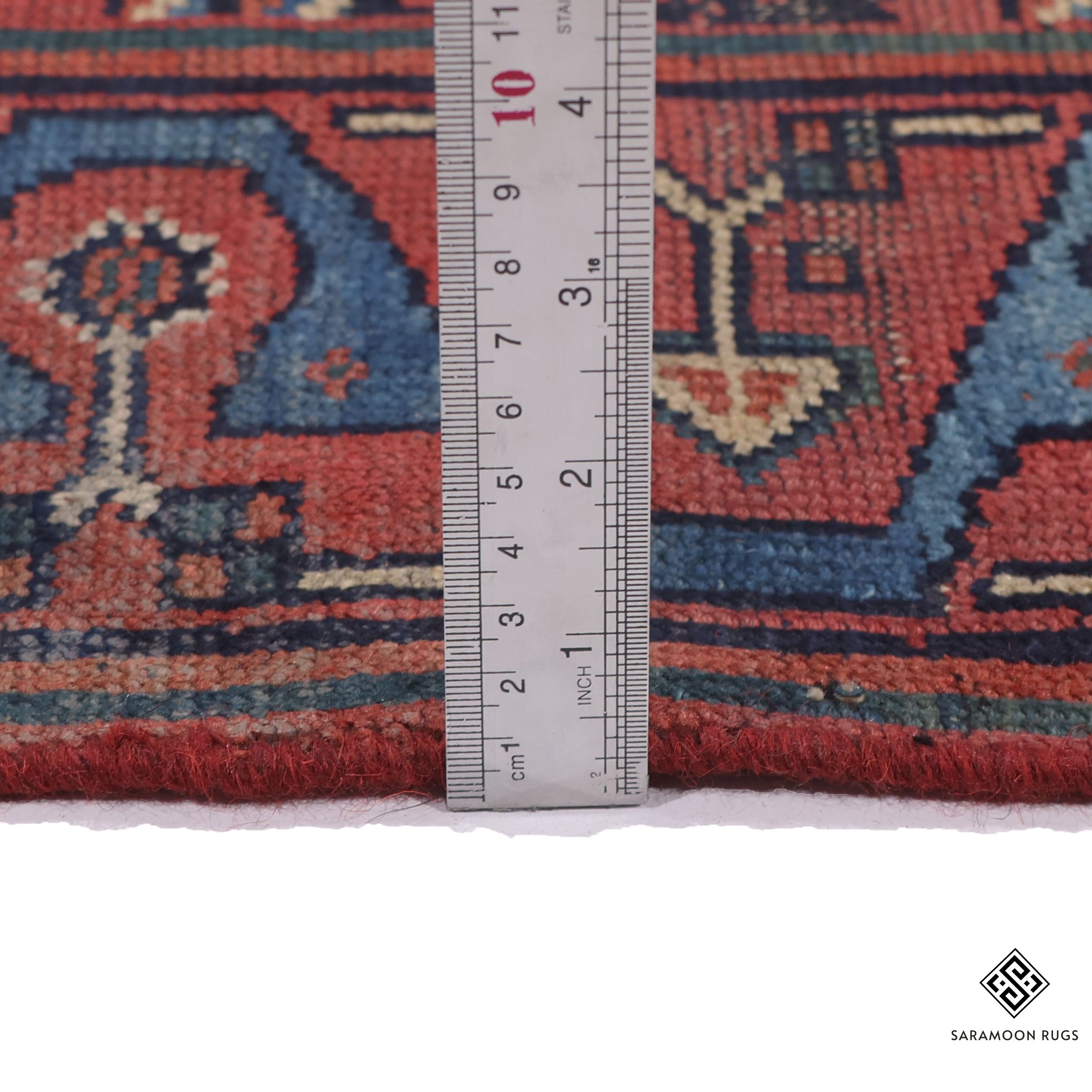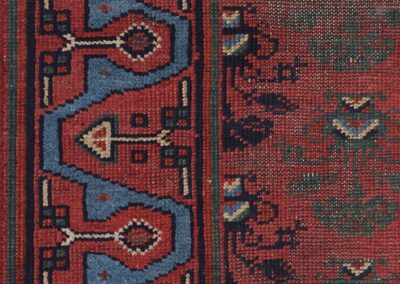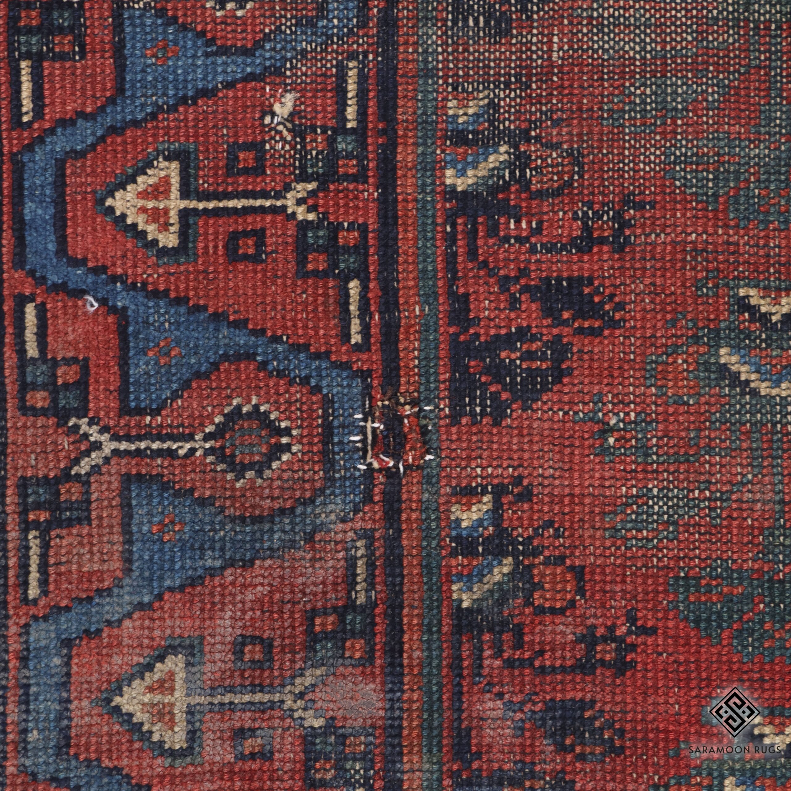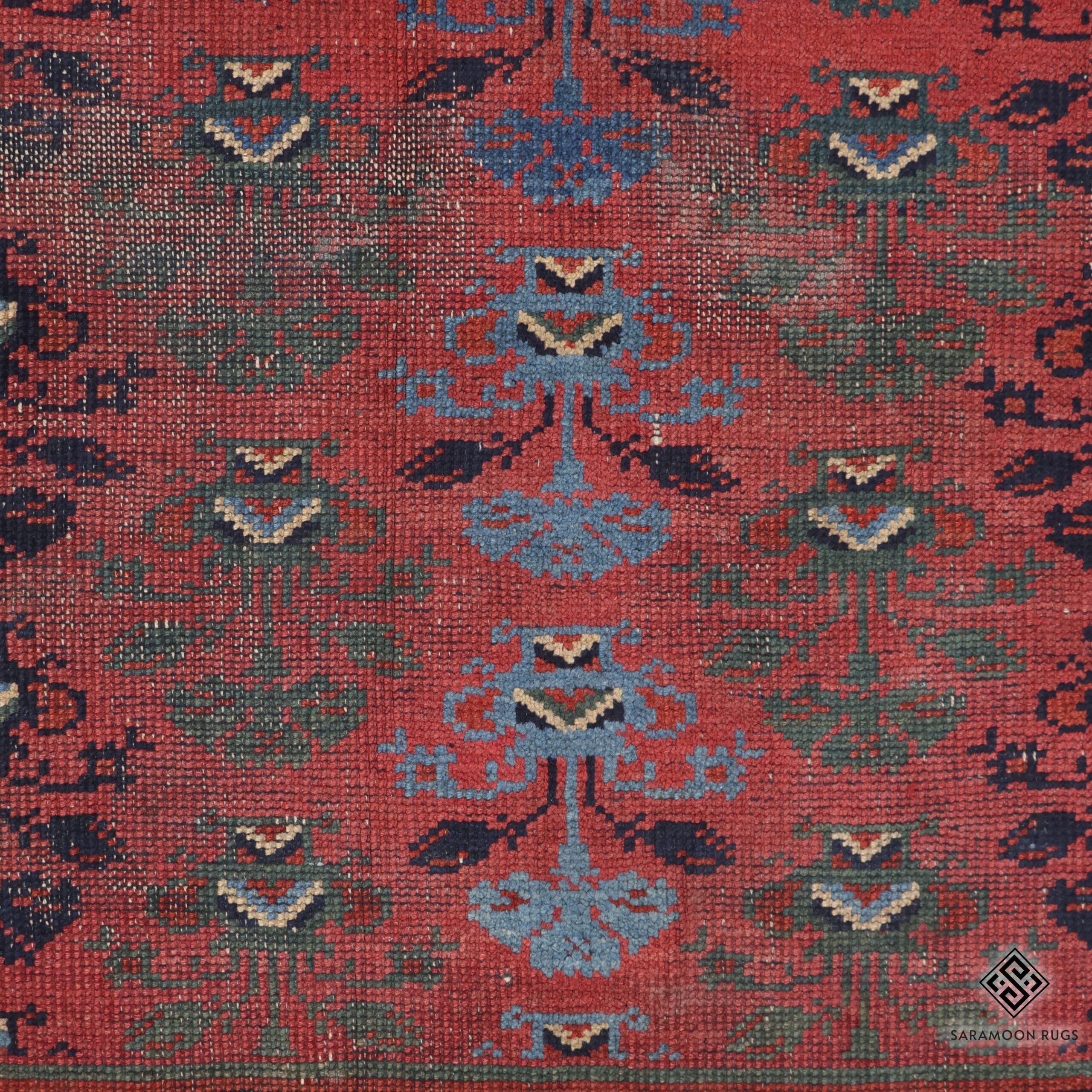 The design presents a mesmerizing field of repeating boteh motifs set against a rich terracotta red background, creating a rhythmic pattern that flows throughout the piece. The border displays a sophisticated geometric design with distinctive blue triangular forms and arrow-like elements, framed by subtle guard borders. The interplay between the deep red ground and the steel blue border creates a striking visual contrast, while touches of forest green and ivory add depth and sophistication to the overall palette.