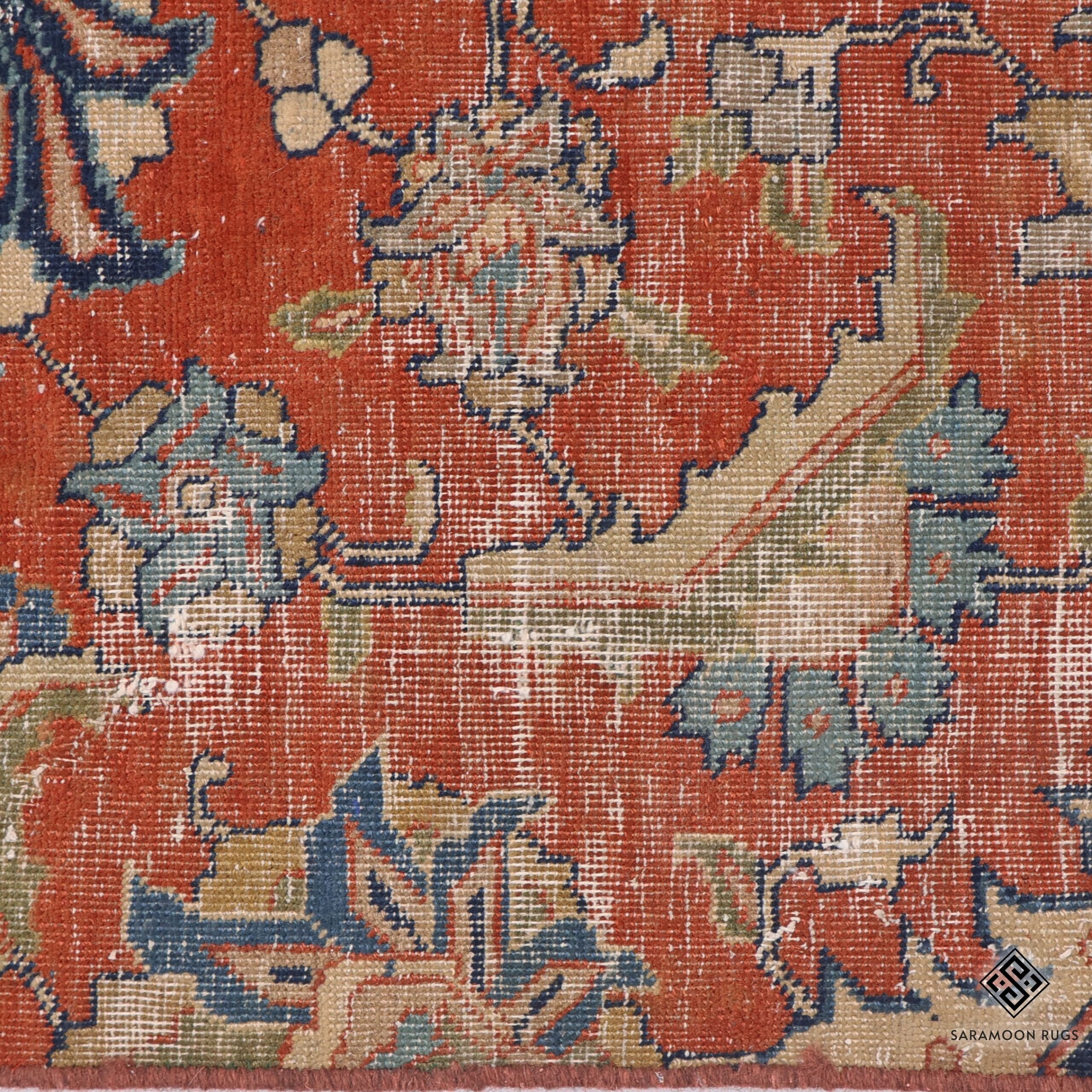 The rug features a classic design with a rich terracotta-red field adorned with an intricate array of floral and botanical motifs. The cream-colored border displays an elegant succession of medallions and palmettes in shades of navy blue, soft sage green, and coral, creating a harmonious frame for the central design. The artful interplay between the geometric and organic elements demonstrates the sophisticated visual vocabulary of traditional Persian design.