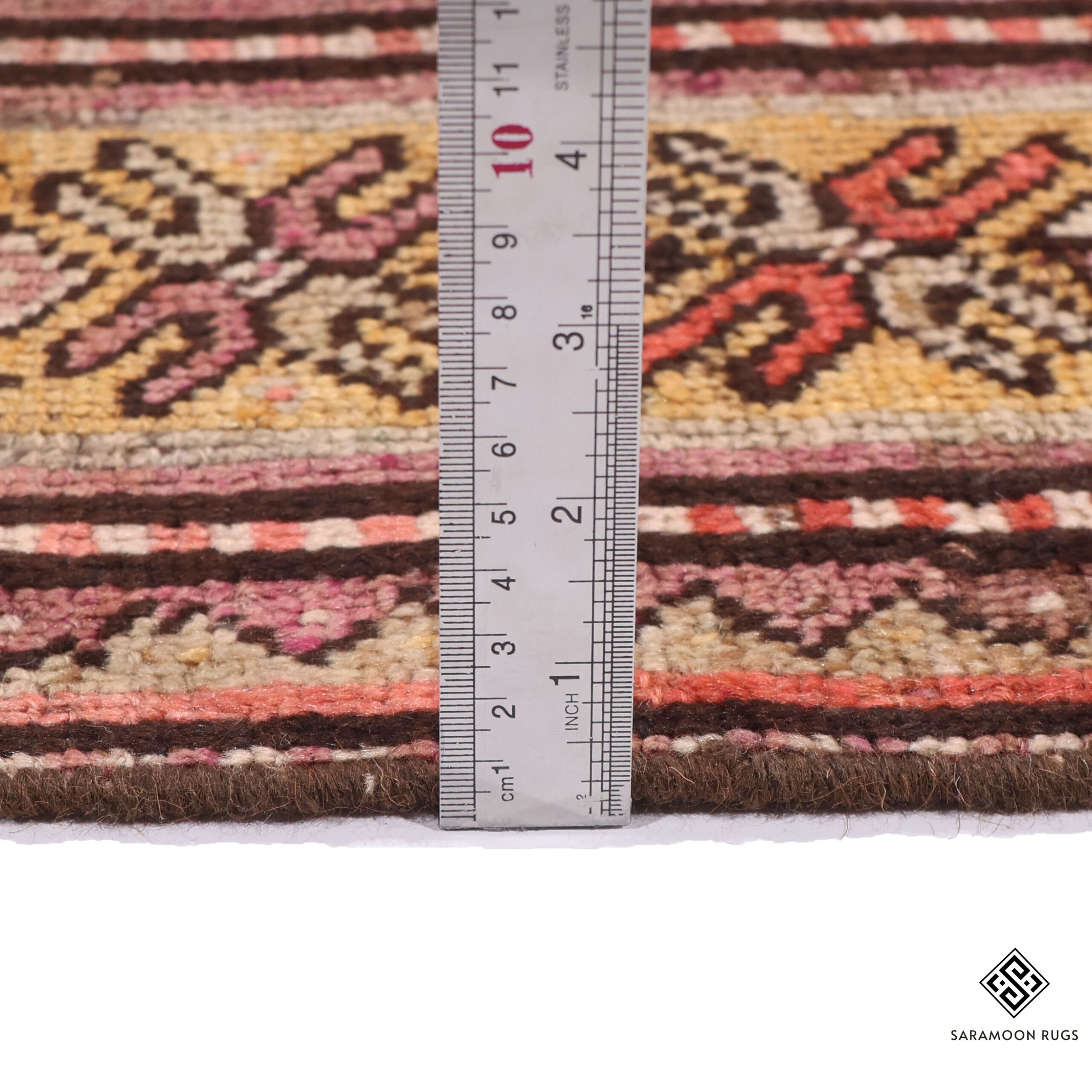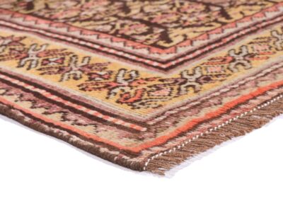 The rug features an elegant central field in a warm brown tone, adorned with a repeating pattern of delicate floral and geometric motifs arranged in vertical columns. The main border displays an intricate gold-hued design with geometric florals and angular patterns, creating a harmonious frame that complements the central composition. The color palette masterfully combines rich brown tones with warm gold accents and subtle coral highlights, creating a sophisticated and versatile piece.