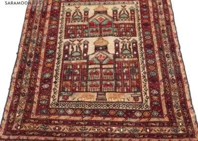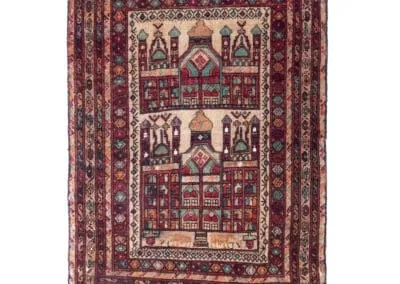 This is a vintage Balooch Persian rug, a true testament to the rich heritage of Persian craftsmanship. The rug showcases a series of intricate geometric and architectural motifs, possibly representing stylized floral patterns and building-like figures. The color palette is a beautiful mix of deep reds, blues, and earthy browns, suggesting age and traditional craftsmanship.