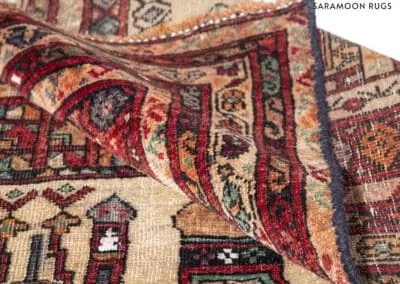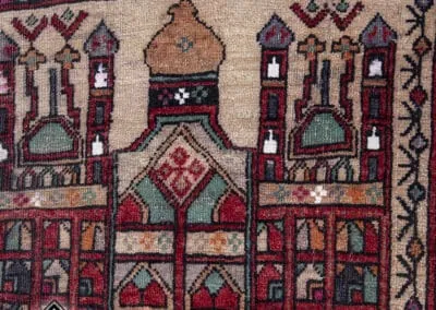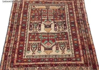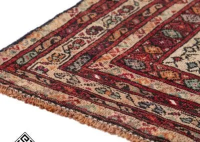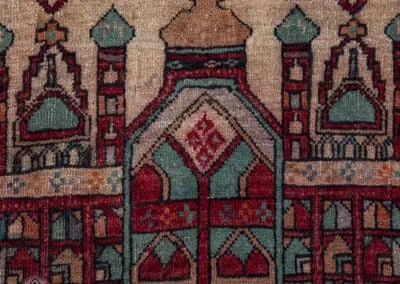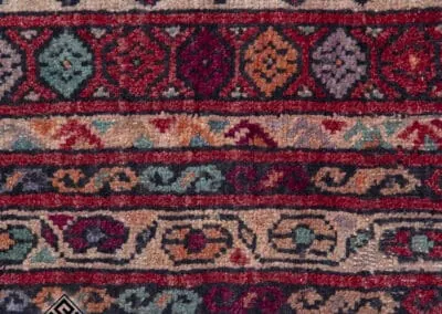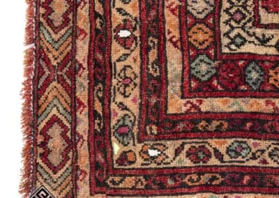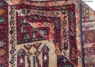 The central field of the rug is framed by multiple borders that contain repeating geometric shapes and detailed embellishments. This complex pattern, combined with the rug’s vintage quality, makes it a captivating piece for collectors or as a decorative item in home decor.