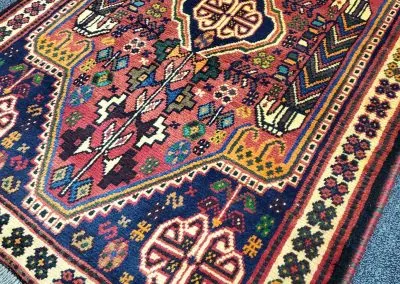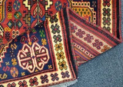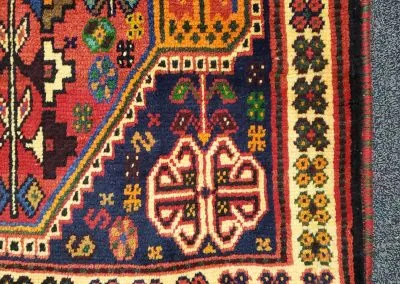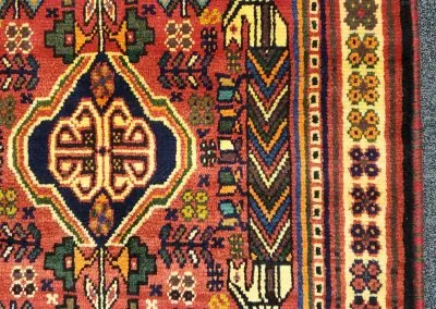 This is a small Shiraz Persian tribal rug. This is a vintage hand-knotted rug in great condition.