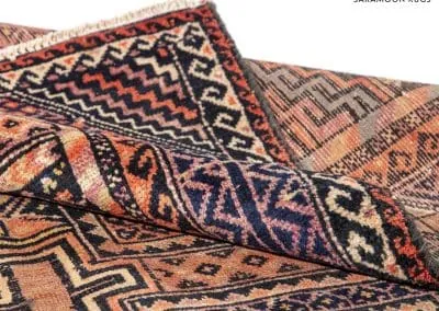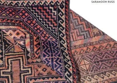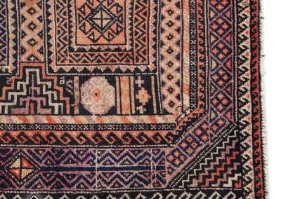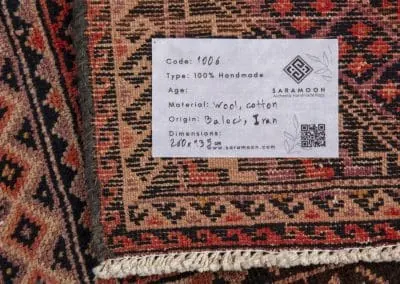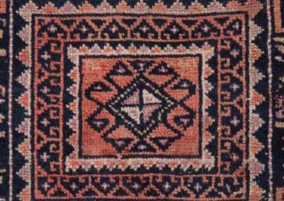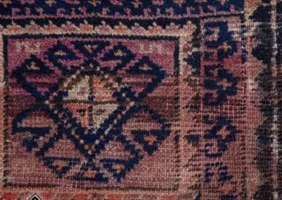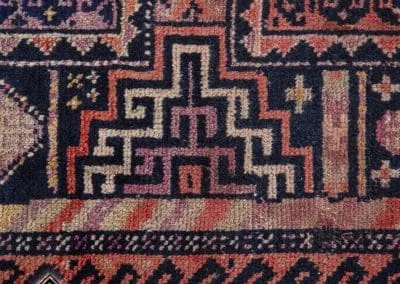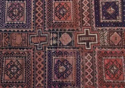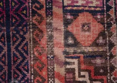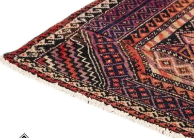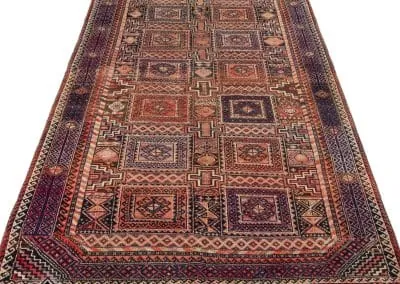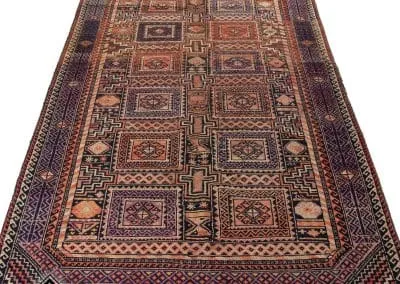 This rug is made in Ghoochan or Qouchan in Khorasan Province. Influenced by Turkmen rugs, it has geometric patterns. The main colors are dark burgundy, indigo, and dark red.