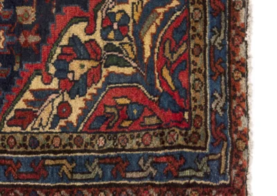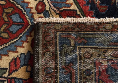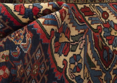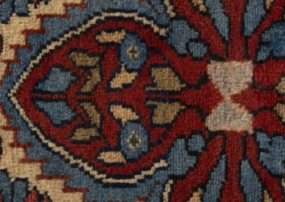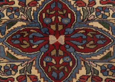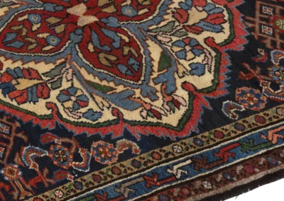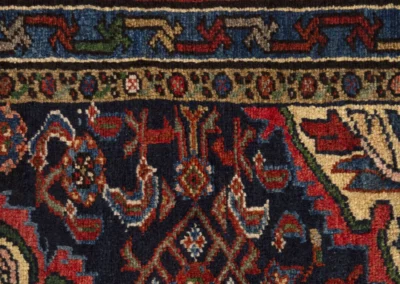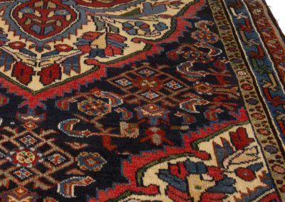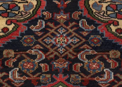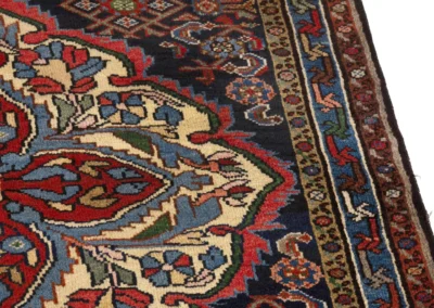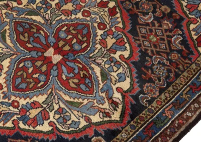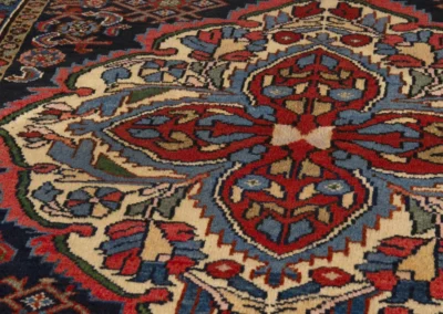 The design architecture reveals exceptional artistry, featuring a bold central medallion rendered in an intricate quatrefoil formation. This stunning centerpiece blooms with elaborate floral palmettes and arabesques in warm cream, vibrant red, and serene blue tones. The navy background is adorned with an all-over pattern of delicate geometric motifs and stylized floral elements that create remarkable visual depth. Corner spandrels echo the central medallion’s design vocabulary, establishing perfect symmetry and balance. The composition is elegantly framed by multiple borders—the main guard border presents a classical rosette and vine pattern in warm camel tones, while the outer border features striking paisley motifs in bold red and cream against a distinguished blue ground. The color palette harmoniously blends deep midnight navy, rich crimson red, warm golden cream, sophisticated slate blue, and subtle touches of olive green and terracotta.