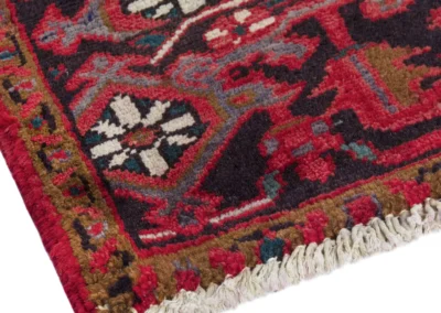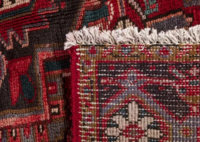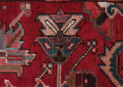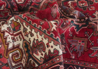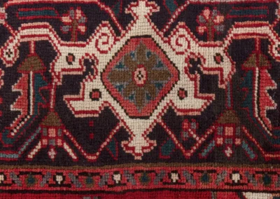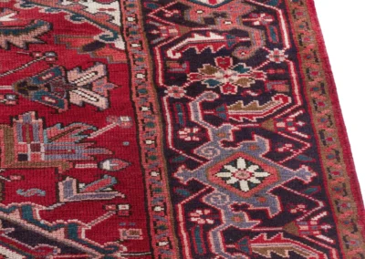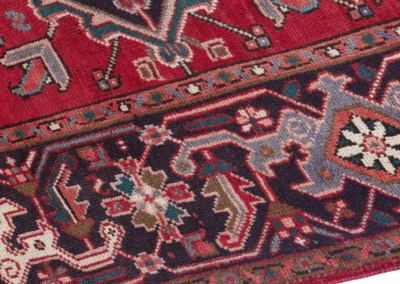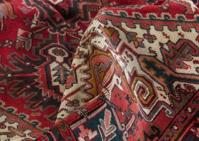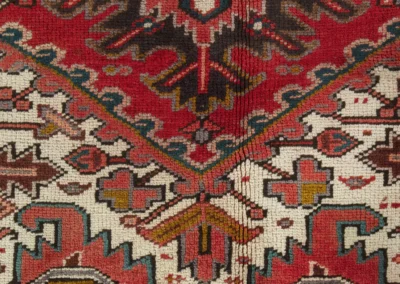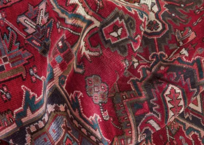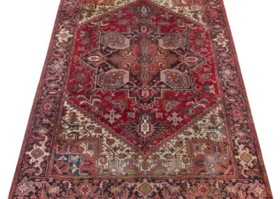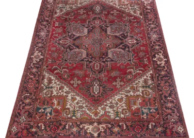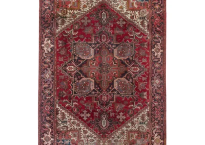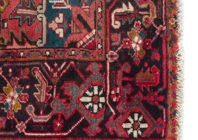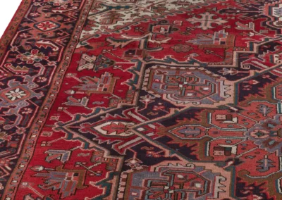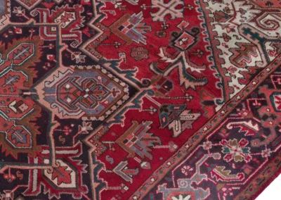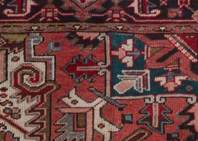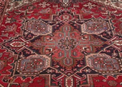 This exceptional piece showcases the robust, village-style craftsmanship characteristic of the Heriz weaving tradition, where durability meets artistic expression. The hand-knotted construction demonstrates remarkable structural integrity, with a substantial pile that has aged beautifully while maintaining excellent condition. The slightly abrash effect—subtle color variations throughout—adds authenticity and visual depth, confirming its handcrafted origins. At this generous room-size proportion, this rug serves as an ideal foundation for sophisticated living rooms, formal dining spaces, or distinguished libraries. Its substantial presence and bold geometric design complement both traditional and contemporary interiors, particularly those embracing maximalist, eclectic, or mid-century modern aesthetics. The warm, complex color palette coordinates effortlessly with wood furnishings, leather upholstery, and jewel-toned accessories, while the geometric precision provides structure to any interior composition.