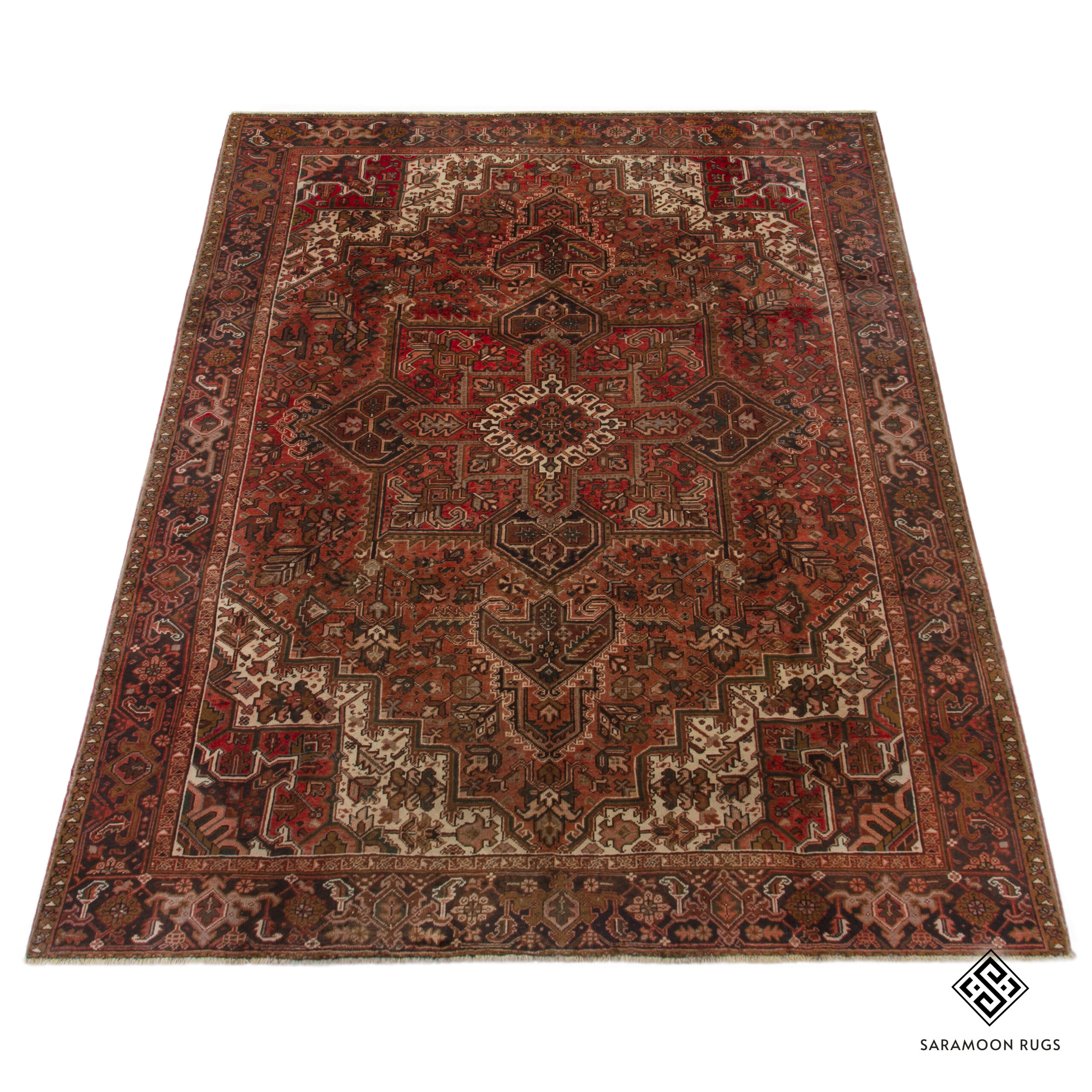 The design follows the classic Heriz format, featuring a dramatic central medallion surrounded by bold geometric motifs that radiate outward with commanding presence. The central medallion displays the characteristic angular styling with serrated edges and stepped contours, rendered in rich terracotta and chocolate brown tones against a vibrant crimson red field. Large cornerpieces, or spandrels, anchor each corner in ivory and soft beige, creating a sophisticated balance to the composition. The field is densely populated with stylized palmettes, rosettes, and angular floral forms executed in the geometric manner distinctive to the region. The main border presents a series of interconnected geometric patterns in warm rust, camel, and charcoal tones, framed by multiple guard borders that add depth and refinement. The color palette is quintessentially Heriz—dominated by warm terracotta reds, deep crimson, chocolate browns, soft ivories, and touches of sage green and indigo blue, all softened and harmonized through decades of natural aging.