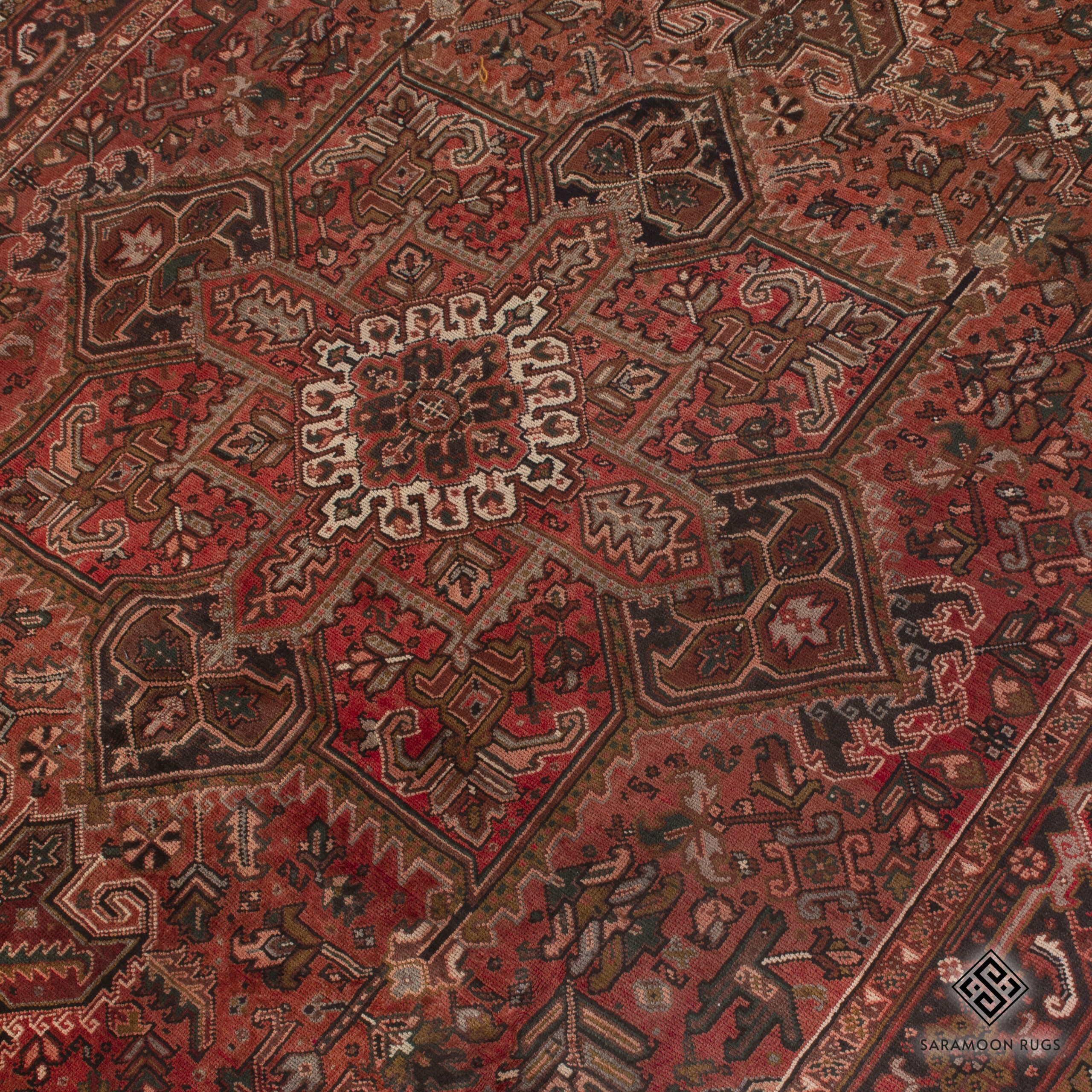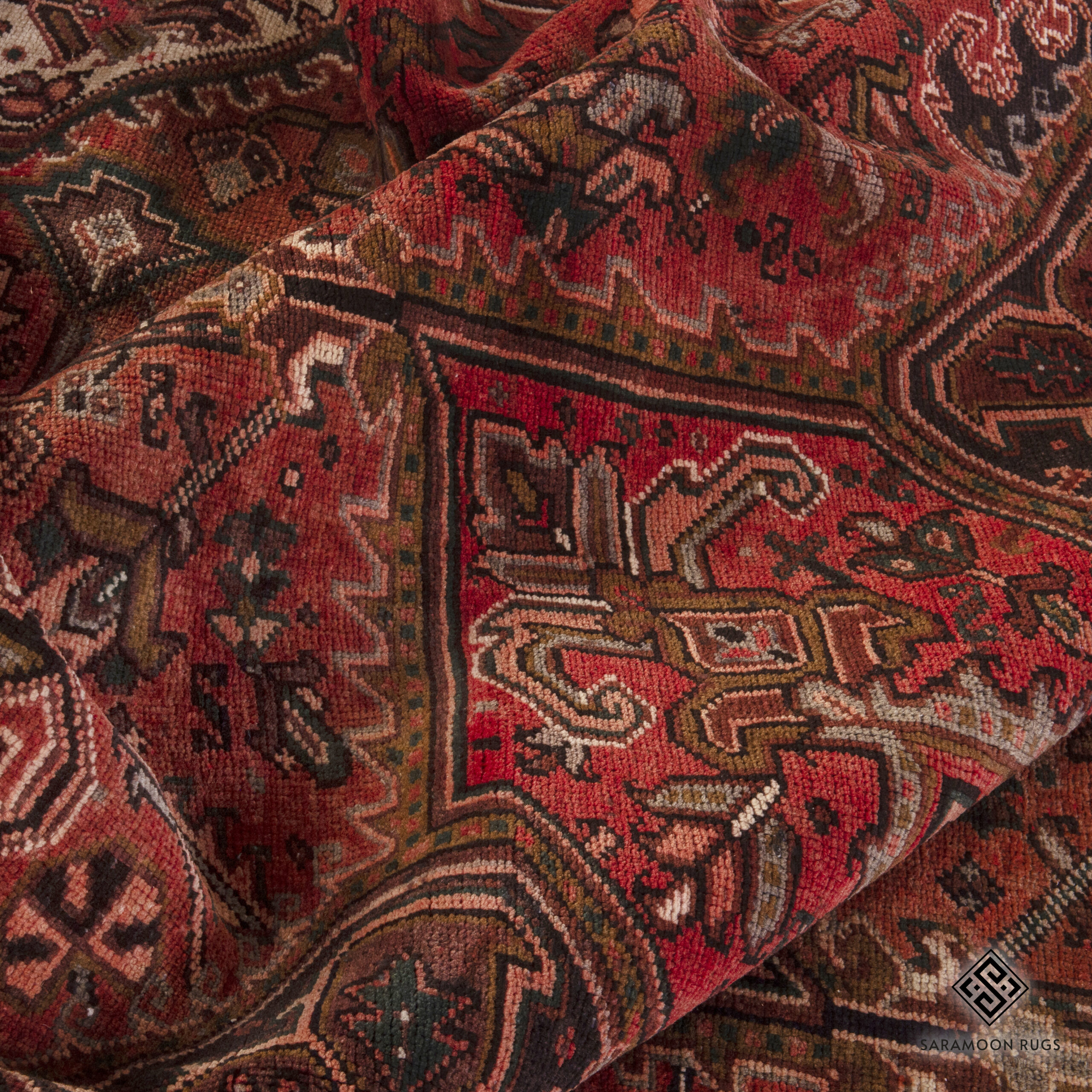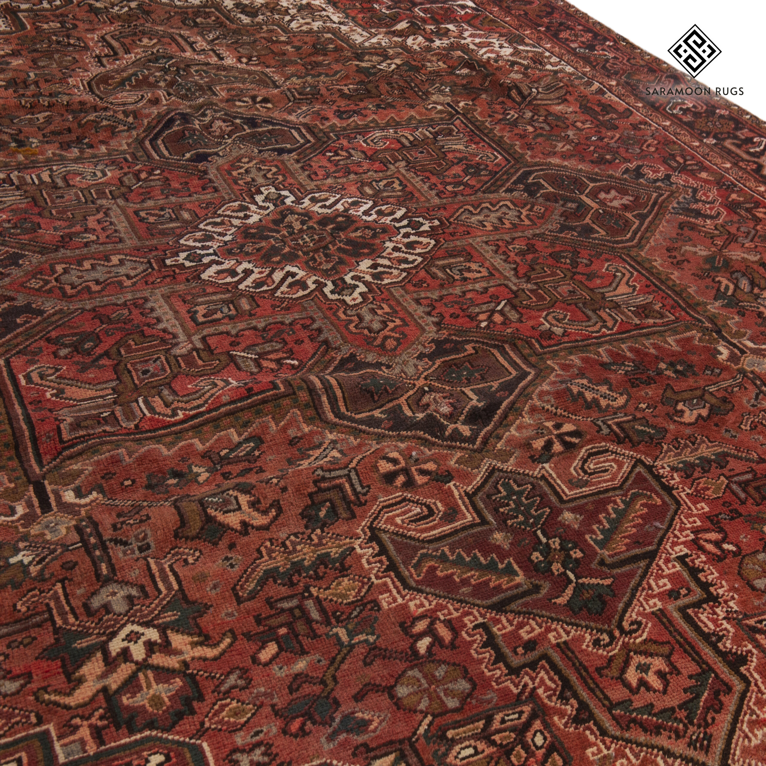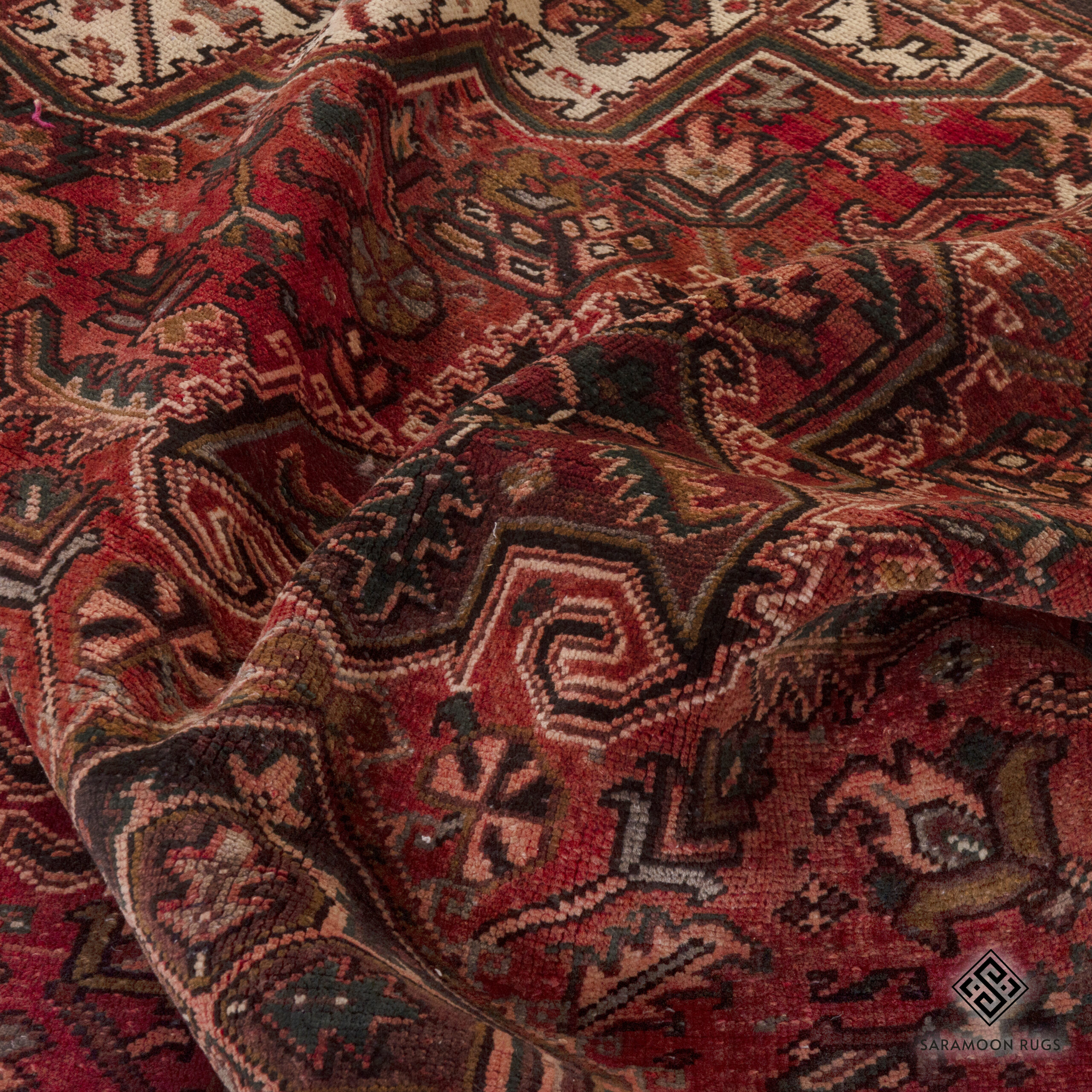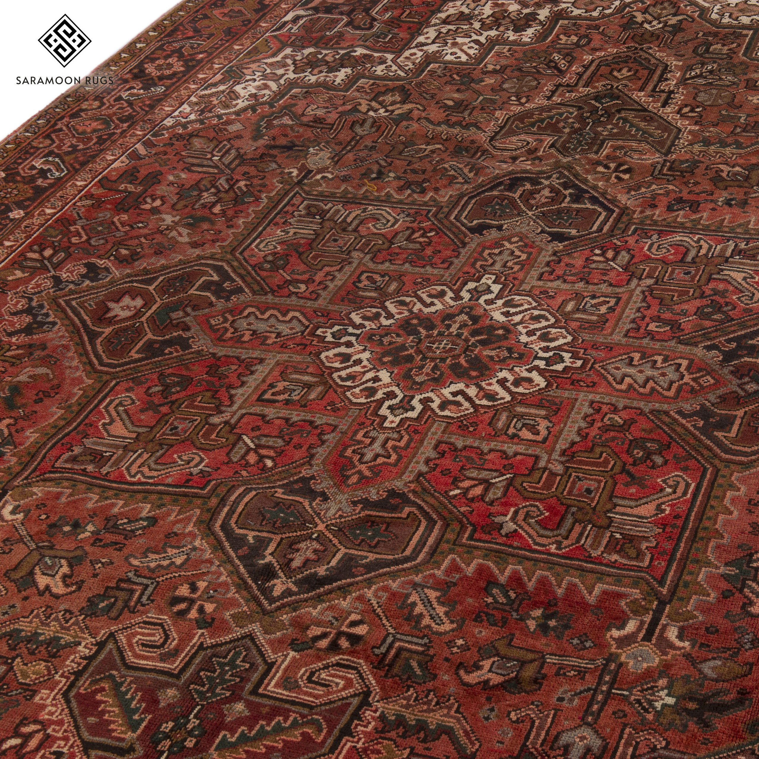 This stunning vintage Heriz rug commands attention with its magnificent presence and timeless architectural composition. The piece showcases the bold, geometric aesthetic that has made Heriz weavings among the most coveted and recognizable of all Persian rug traditions. Its substantial proportions and striking visual impact create an immediate sense of grandeur, while the beautifully mellowed patina speaks to decades of graceful aging, imbuing the piece with an authentic vintage character that cannot be replicated in contemporary productions.