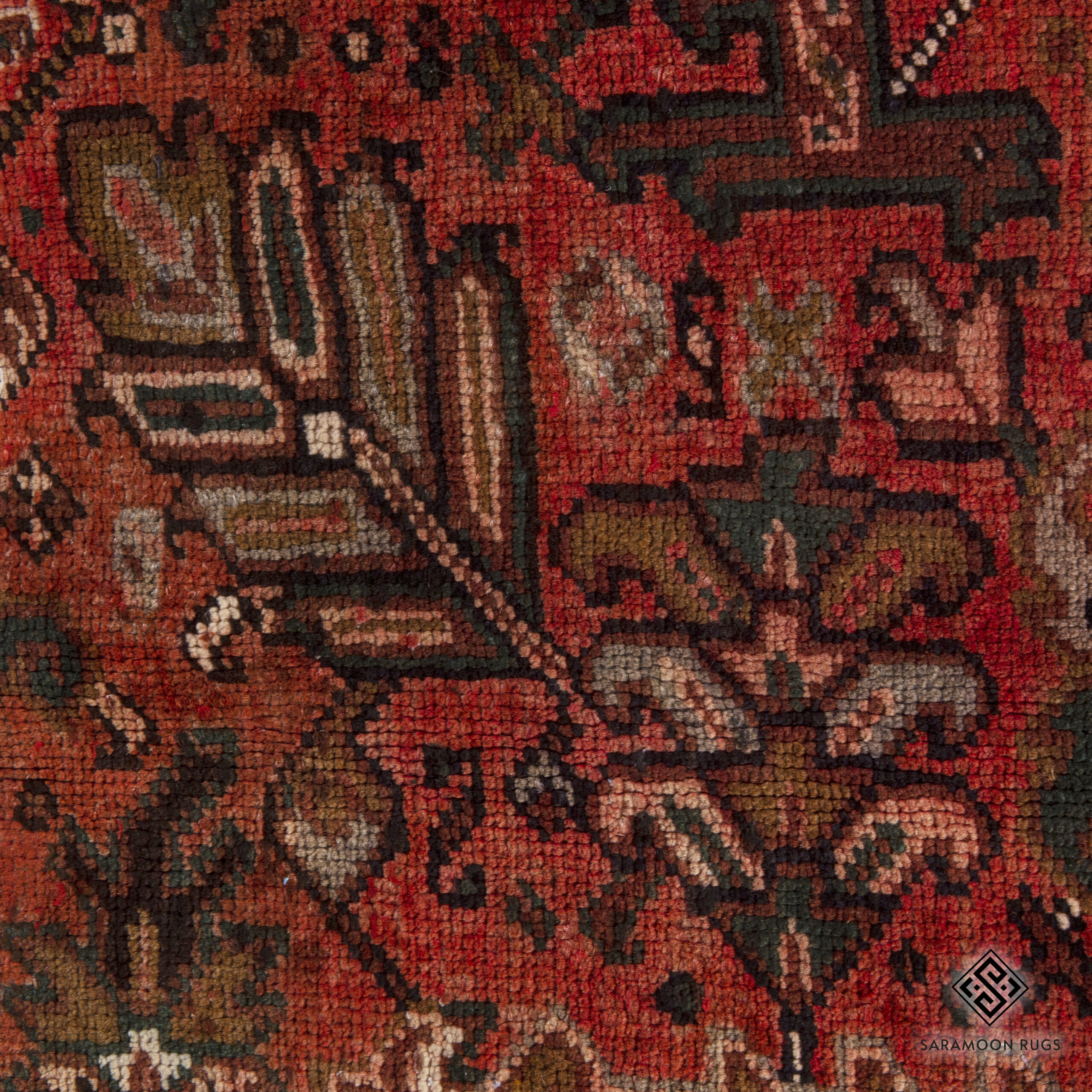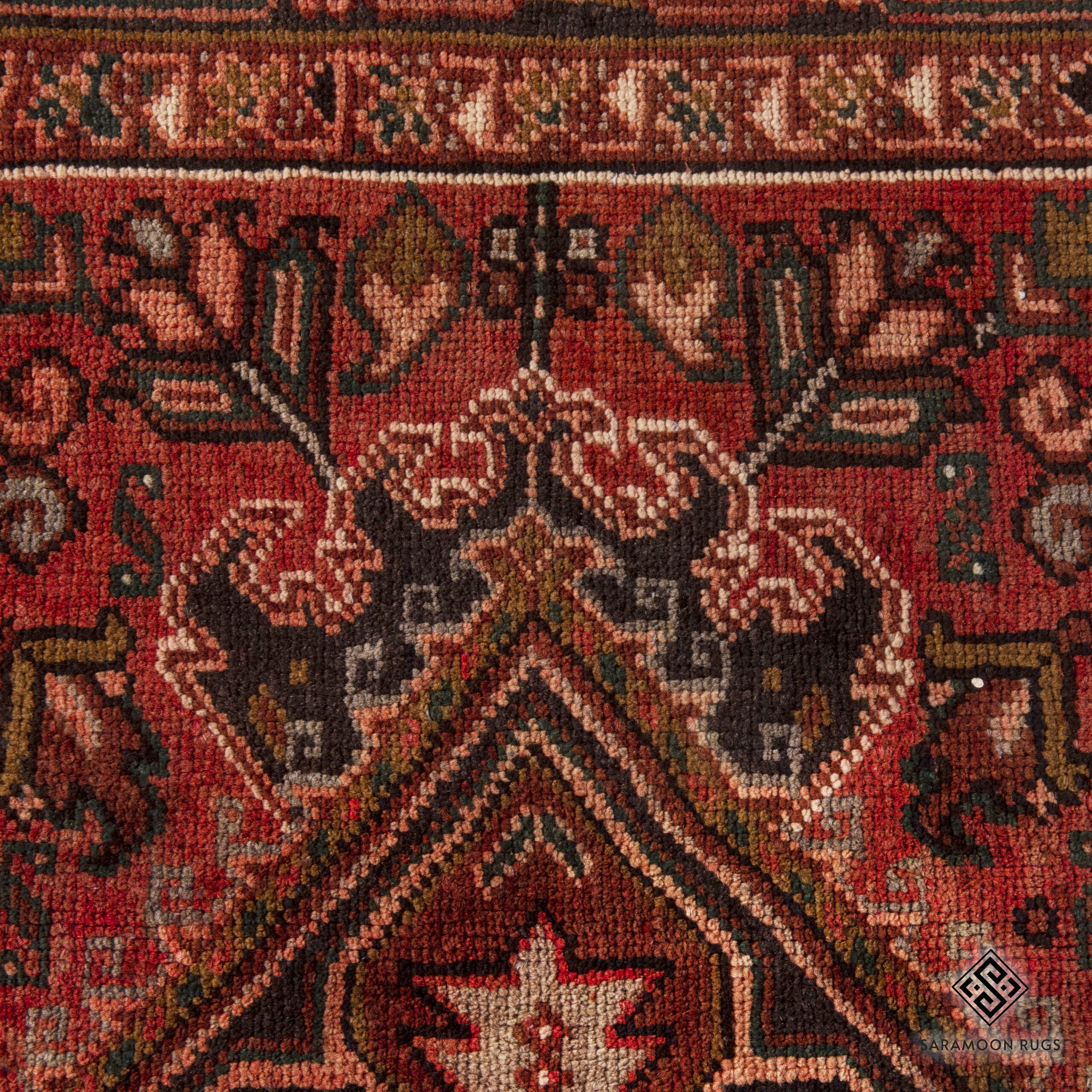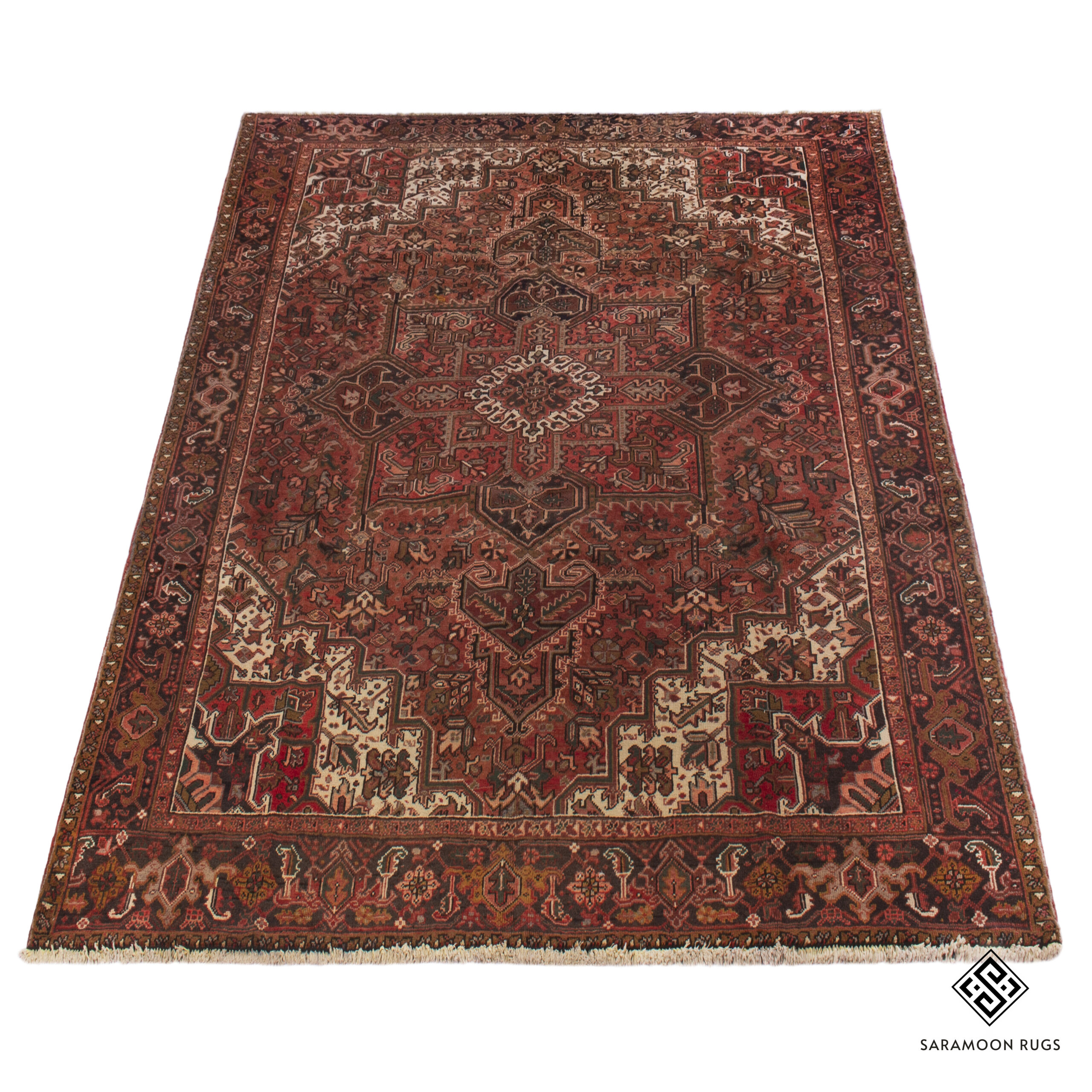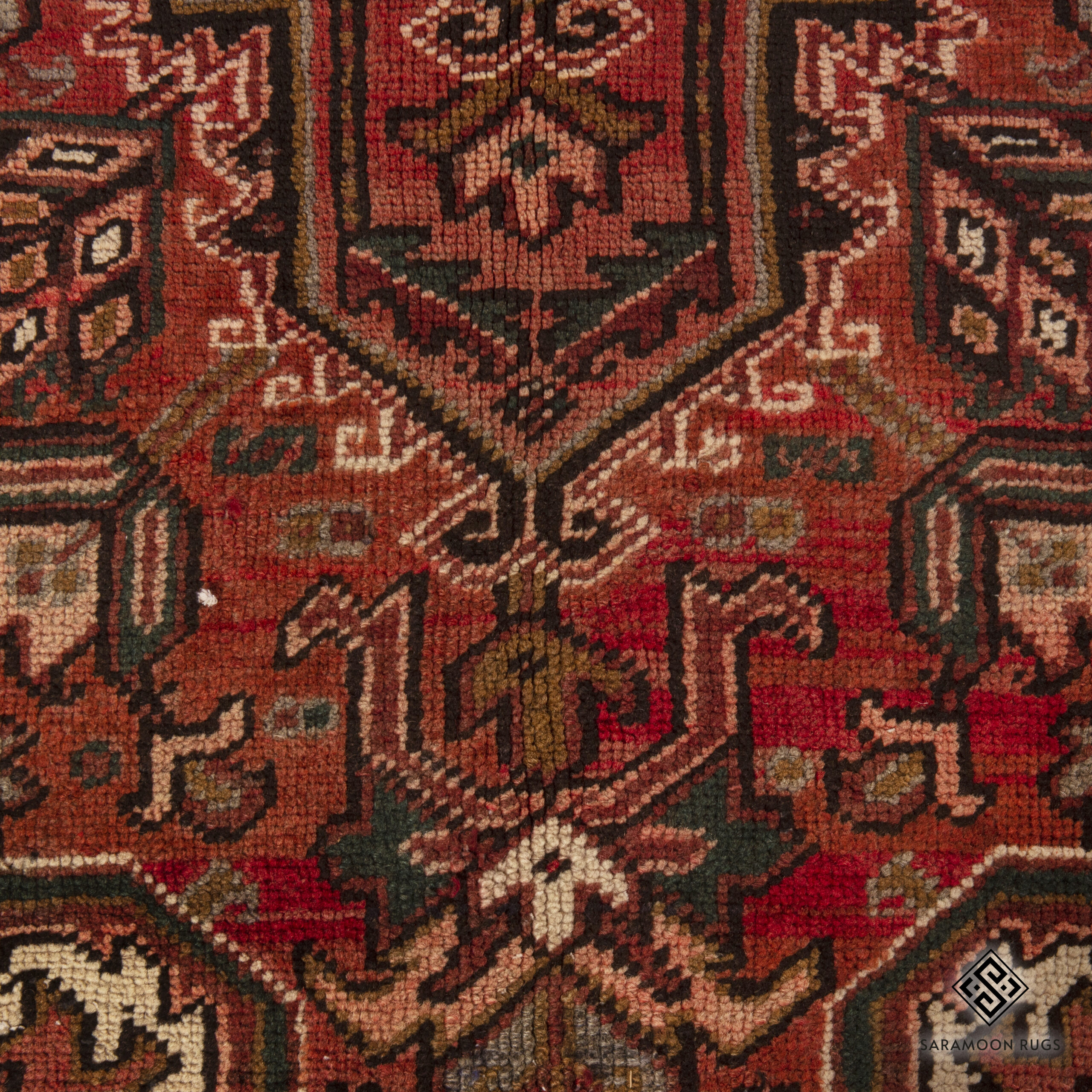 This stunning vintage Heriz rug commands attention with its magnificent presence and timeless architectural composition. The piece showcases the bold, geometric aesthetic that has made Heriz weavings among the most coveted and recognizable of all Persian rug traditions. Its substantial proportions and striking visual impact create an immediate sense of grandeur, while the beautifully mellowed patina speaks to decades of graceful aging, imbuing the piece with an authentic vintage character that cannot be replicated in contemporary productions.