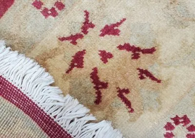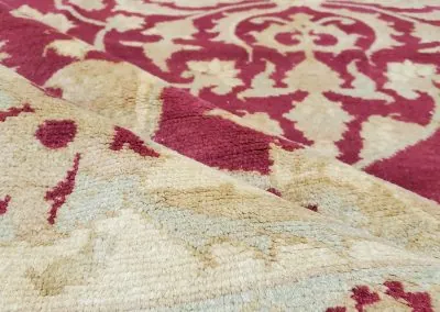 Pile material is 100% natural fine wool and foundation are made of natural cotton.