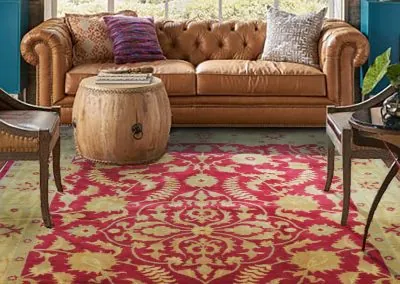 Hand-knotted Tabriz wool rug showcasing an elegant oriental design in vibrant red and gold tones. Thick pile with premium wool on cotton foundation.