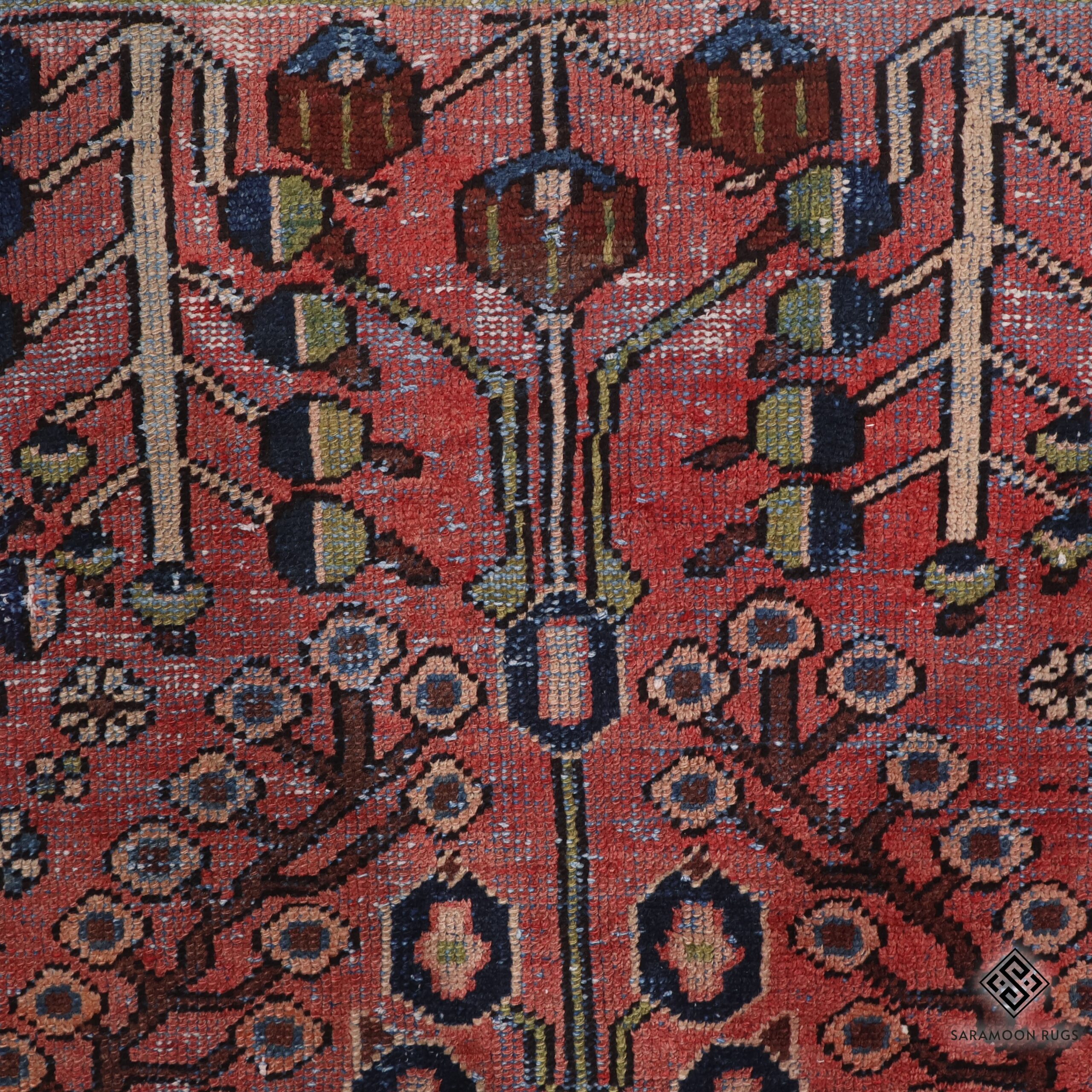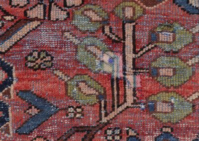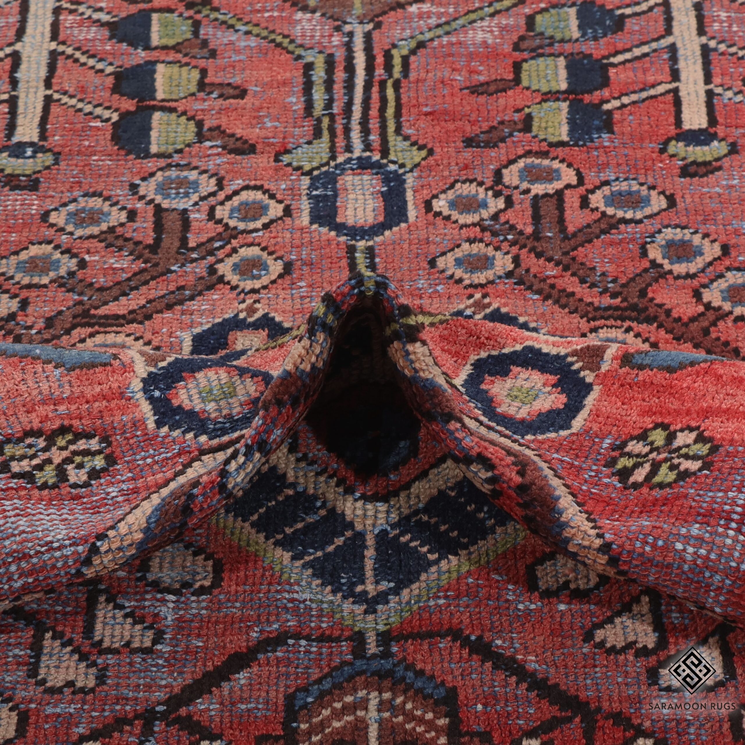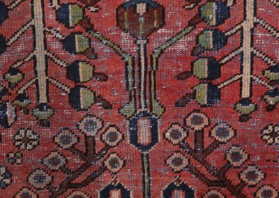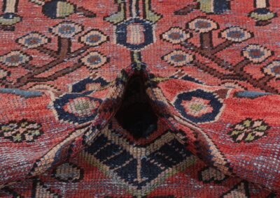 The design features a striking symmetrical pattern centered around a sophisticated medallion motif in deep navy blue, which anchors the entire composition. Branching outward are elegant floral and geometric motifs, creating a mesmerizing “tree of life” pattern that extends throughout the rich red field. The artisan’s skillful use of color is evident in the harmonious blend of navy blue, sage green, and warm beige accents against the dominant red background, creating a sophisticated interplay of hues that adds depth and visual interest.