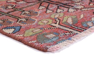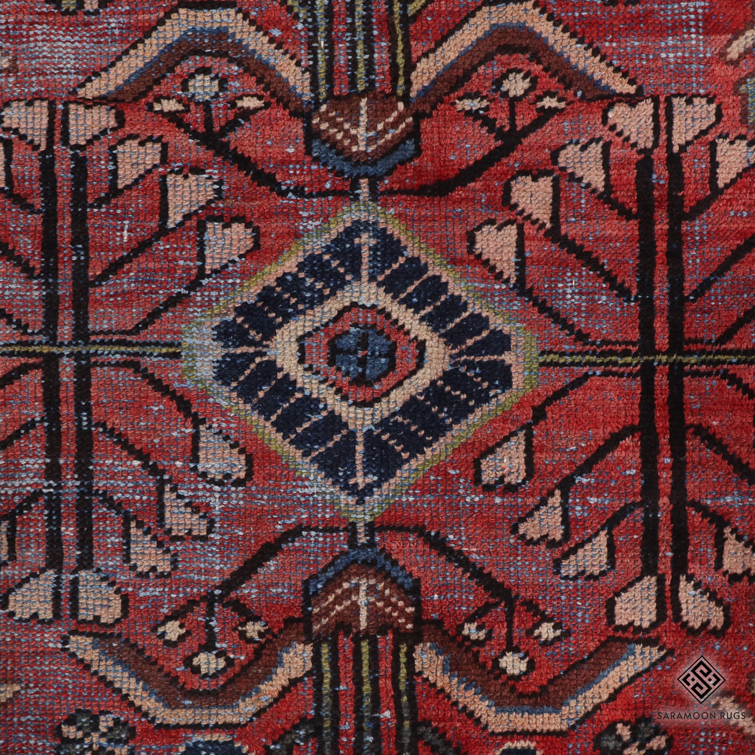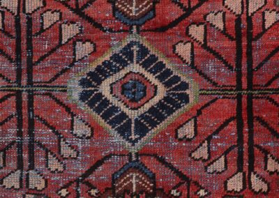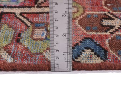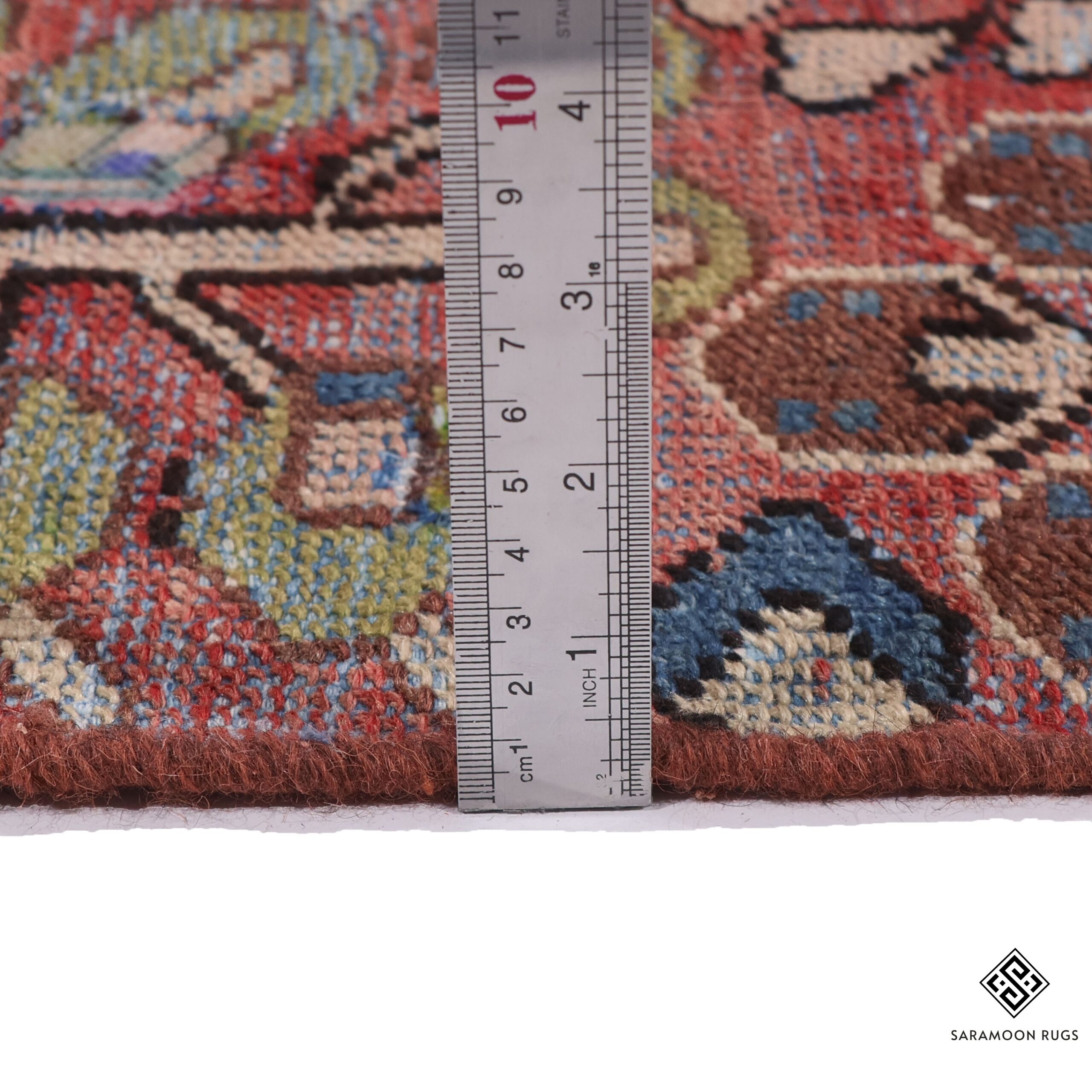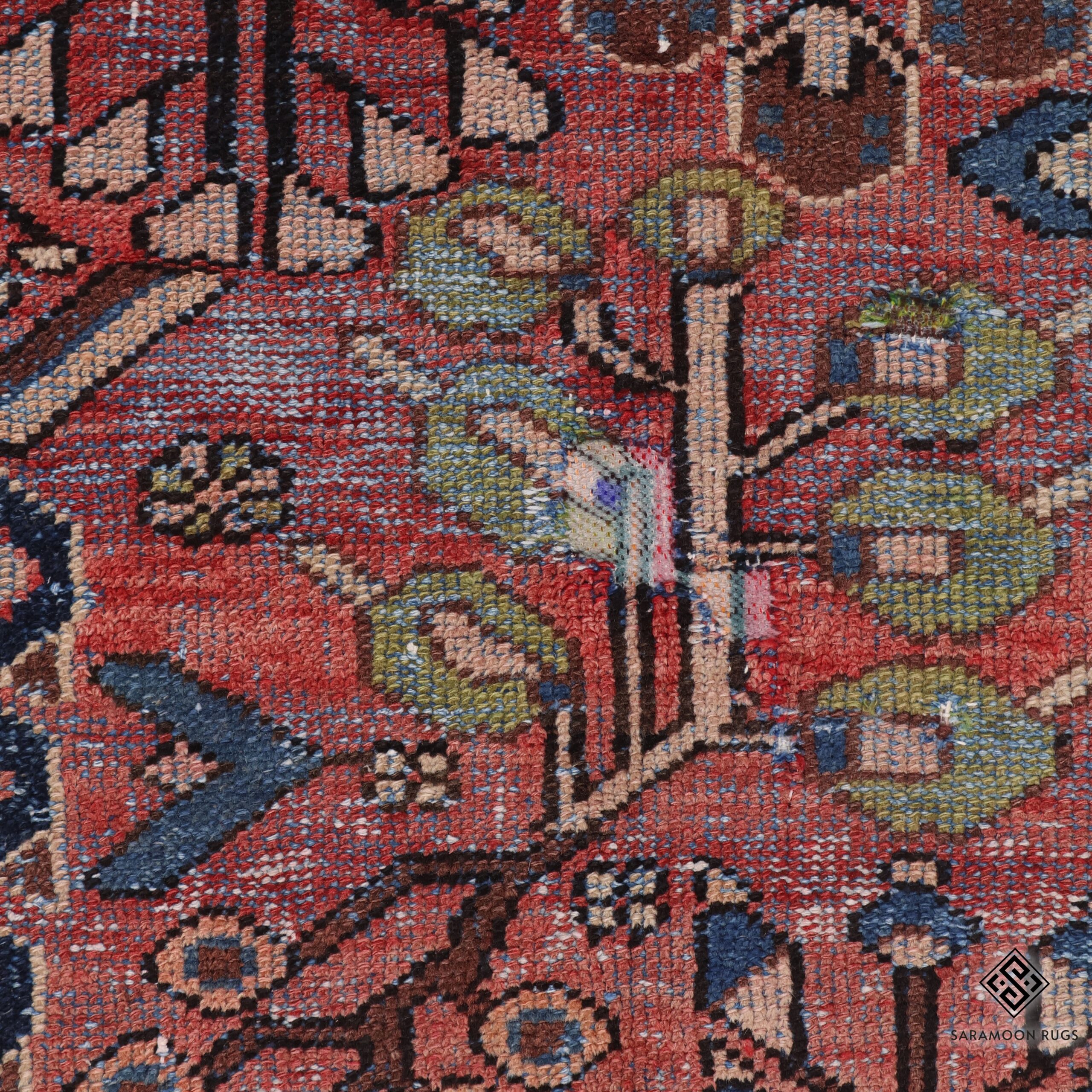 The design features a striking symmetrical pattern centered around a sophisticated medallion motif in deep navy blue, which anchors the entire composition. Branching outward are elegant floral and geometric motifs, creating a mesmerizing “tree of life” pattern that extends throughout the rich red field. The artisan’s skillful use of color is evident in the harmonious blend of navy blue, sage green, and warm beige accents against the dominant red background, creating a sophisticated interplay of hues that adds depth and visual interest.