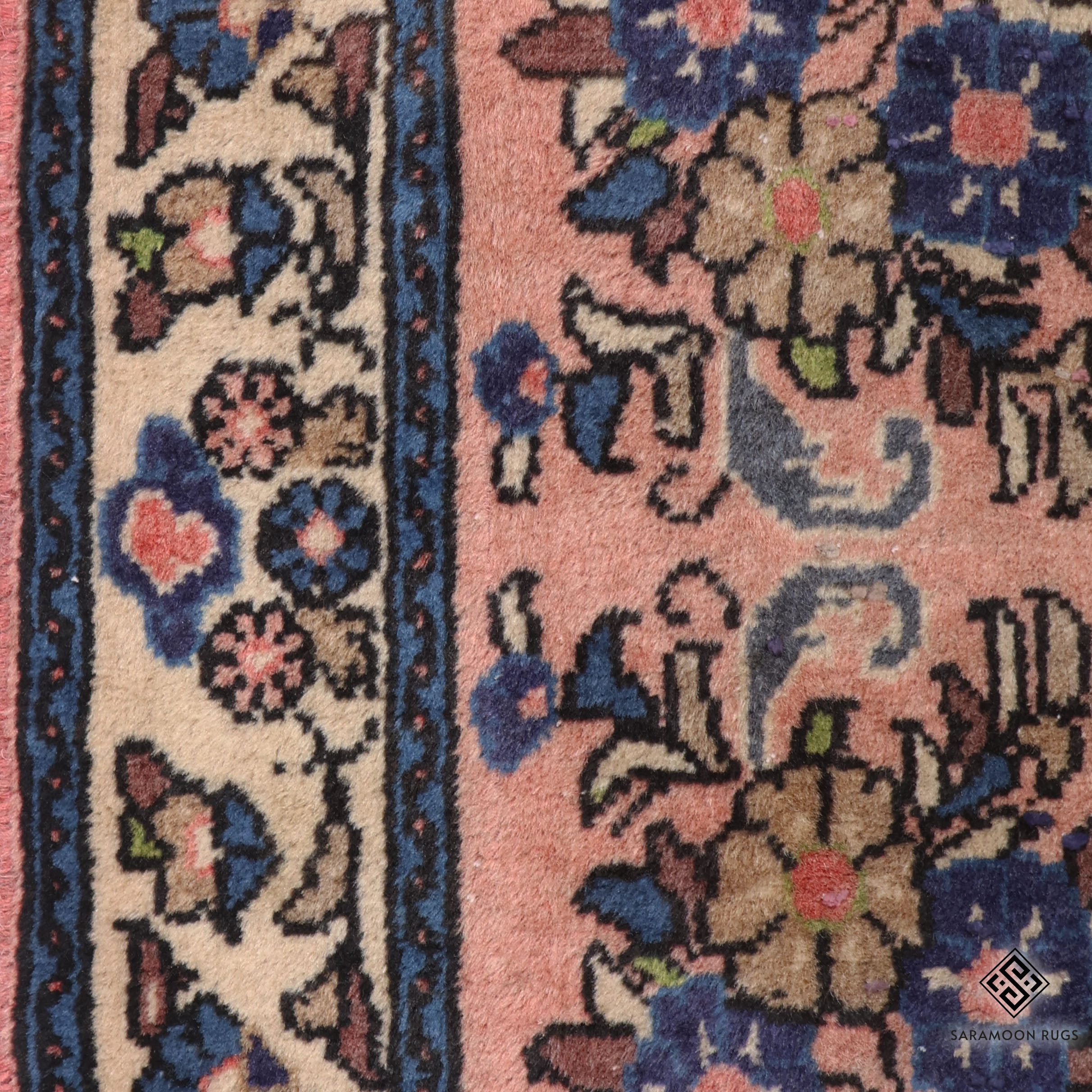The rug features an intricate floral medallion pattern set against a gentle salmon-pink background, creating a warm and inviting aesthetic. The main field displays a mesmerizing array of navy blue rosettes, delicate vine scrolls, and palmettes arranged in a symmetrical pattern. The cream-colored border is adorned with a continuous floral motif, complemented by navy blue guard bands that frame the composition beautifully. Subtle touches of sage green and burgundy throughout the design add depth and visual interest to the overall palette.