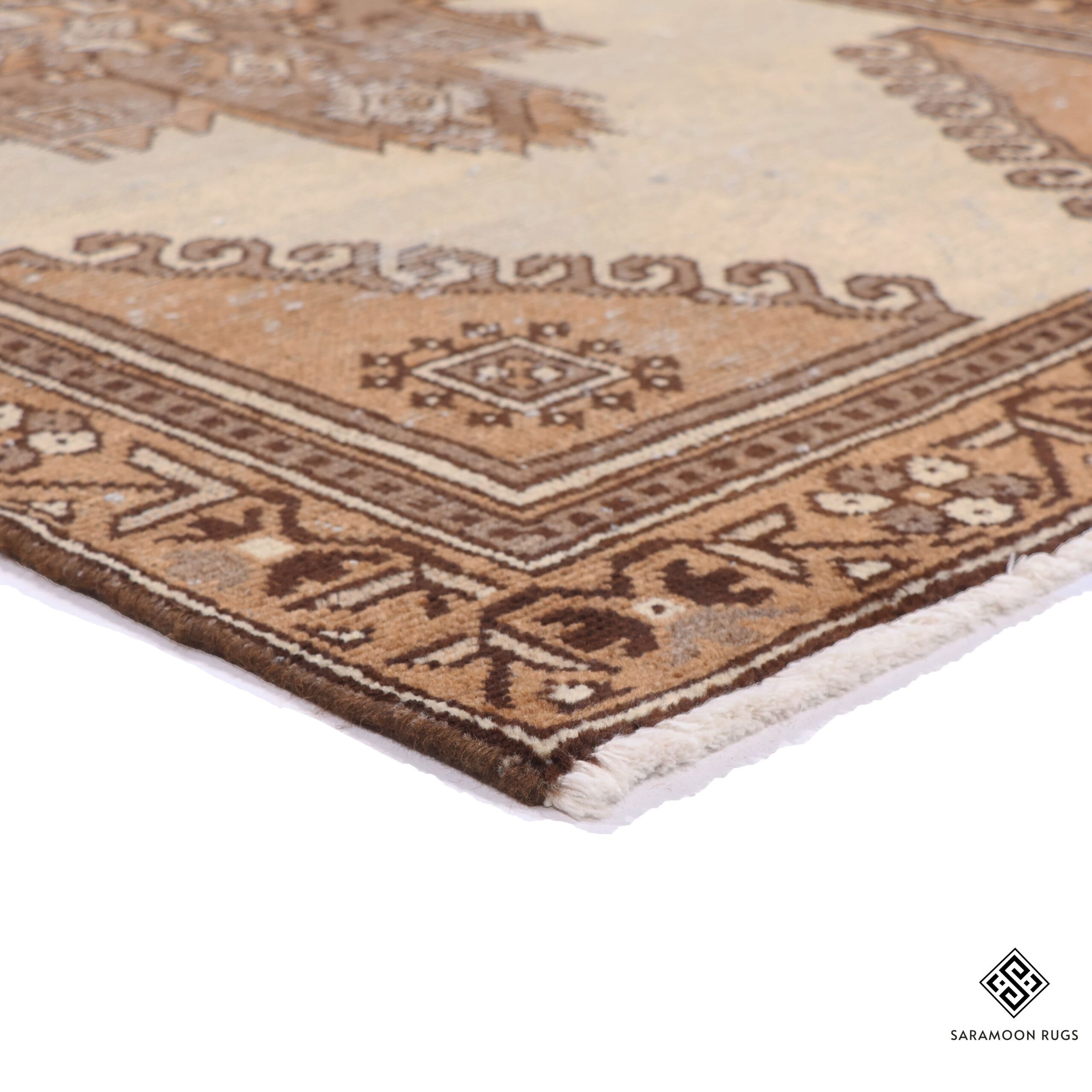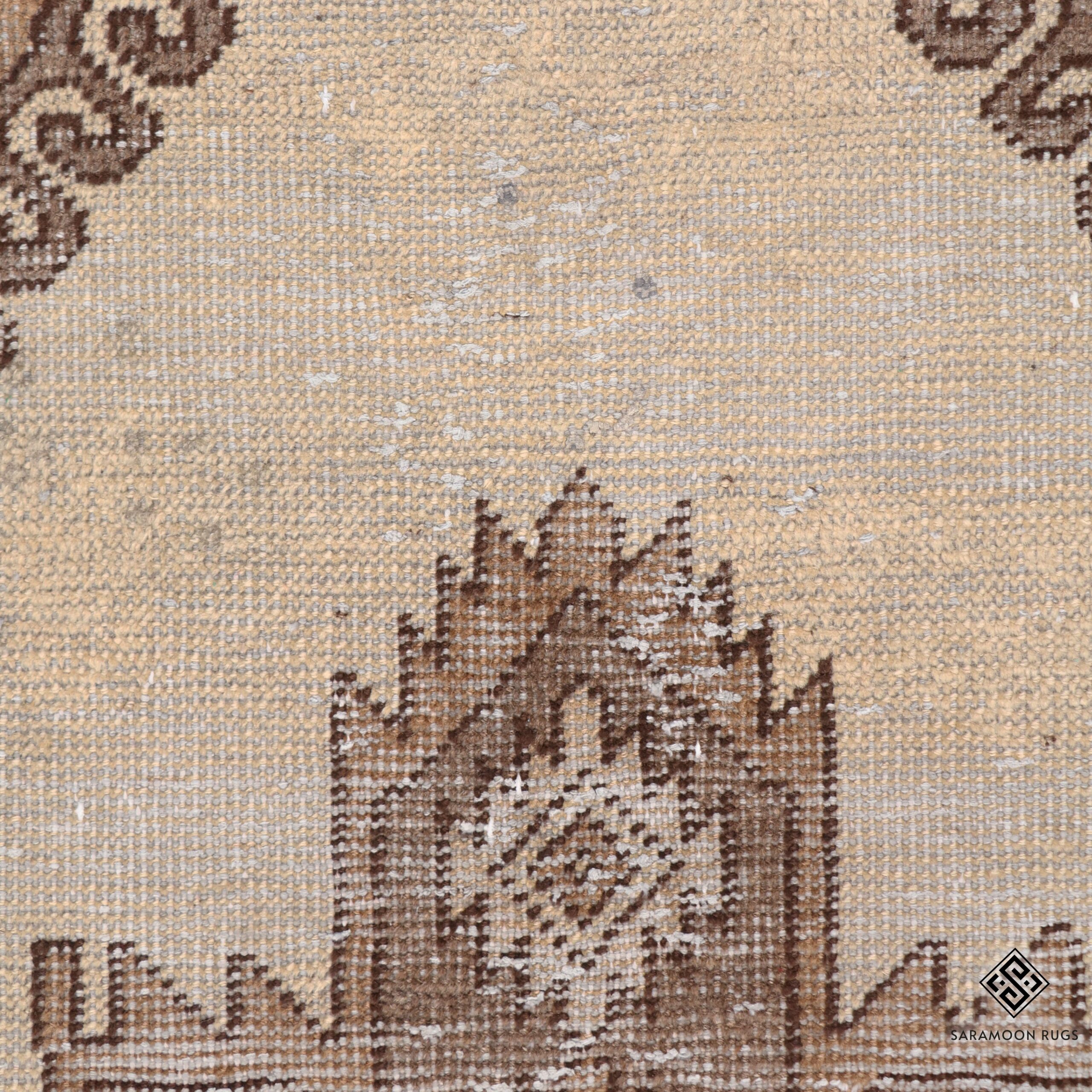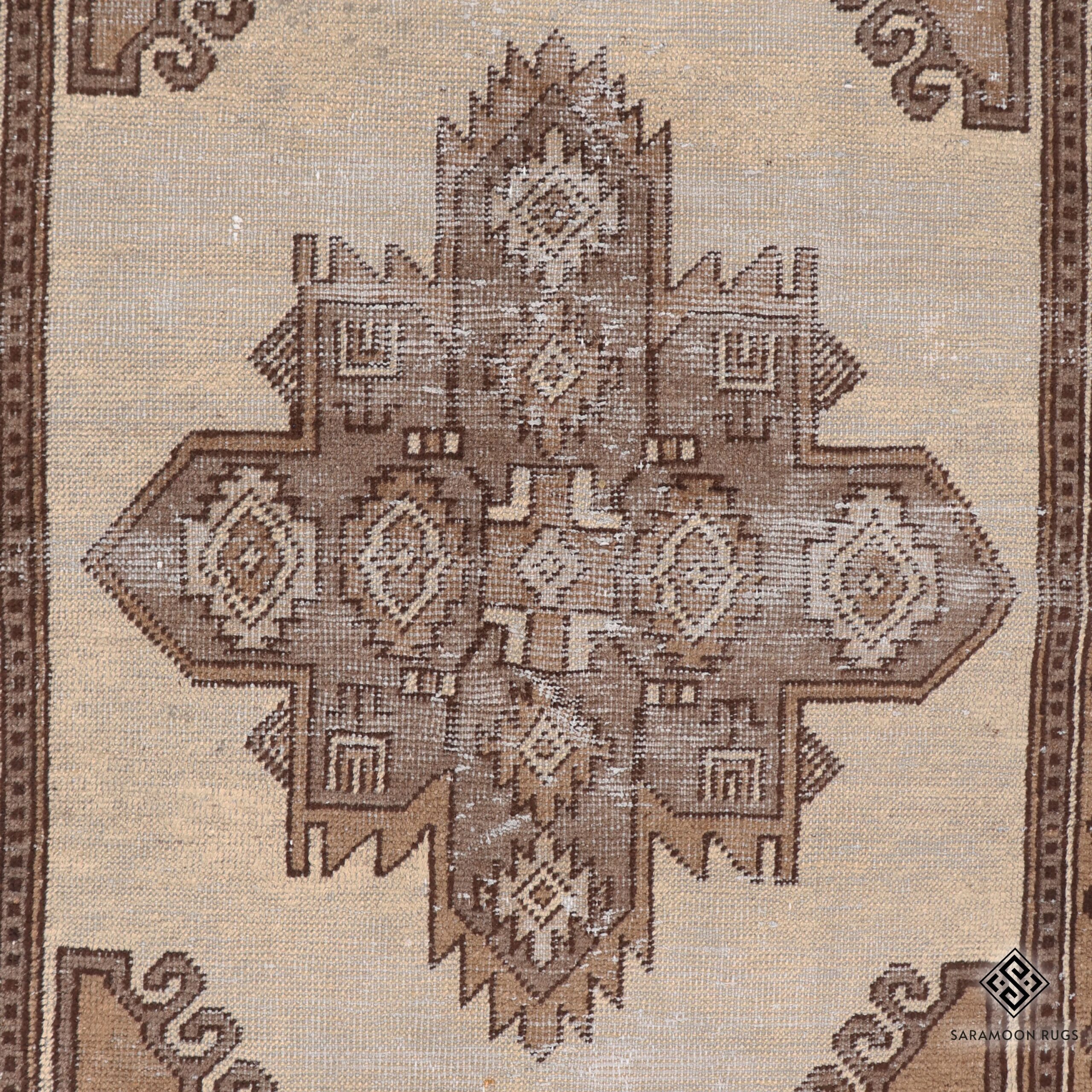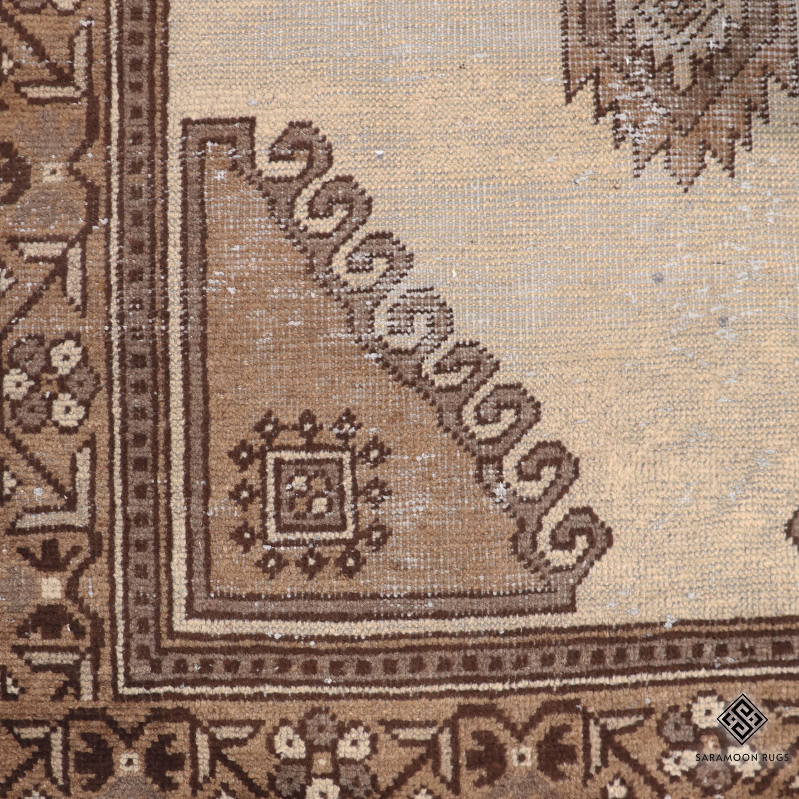 The rug features a striking central medallion in the form of a geometric cross, rendered in soft brown hues against a serene cream background. The medallion is adorned with intricate angular patterns and diamond motifs, creating a captivating interplay of geometric shapes. The corners are embellished with graceful curved designs, while the gold-toned border displays a continuous pattern of stylized floral motifs, providing a harmonious frame for the central design.