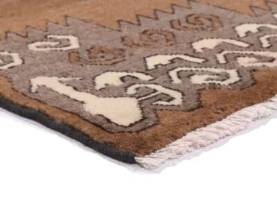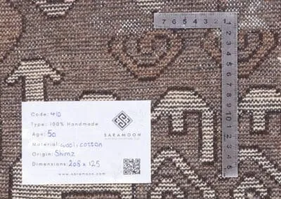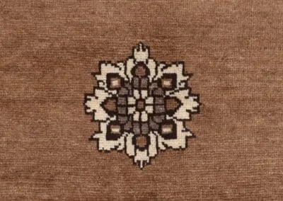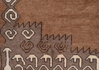 This 50-year-old rug exemplifies exceptional craftsmanship with its tight weave and meticulous attention to detail. The piece would serve beautifully as a sophisticated focal point in a modern living space, home office, or dining area, where its understated elegance can enhance contemporary or traditional décor. Despite showing some signs of age-related wear, which adds to its authentic character, the rug maintains its structural integrity and artistic appeal.