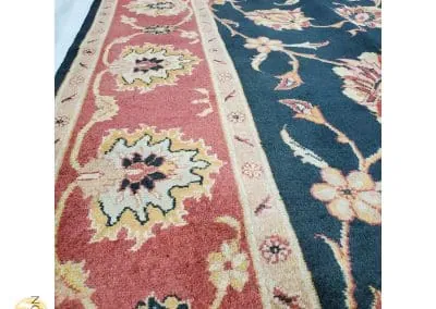 The background colour is black with a little dark green tone. The rug has a high pile and is in great condition.