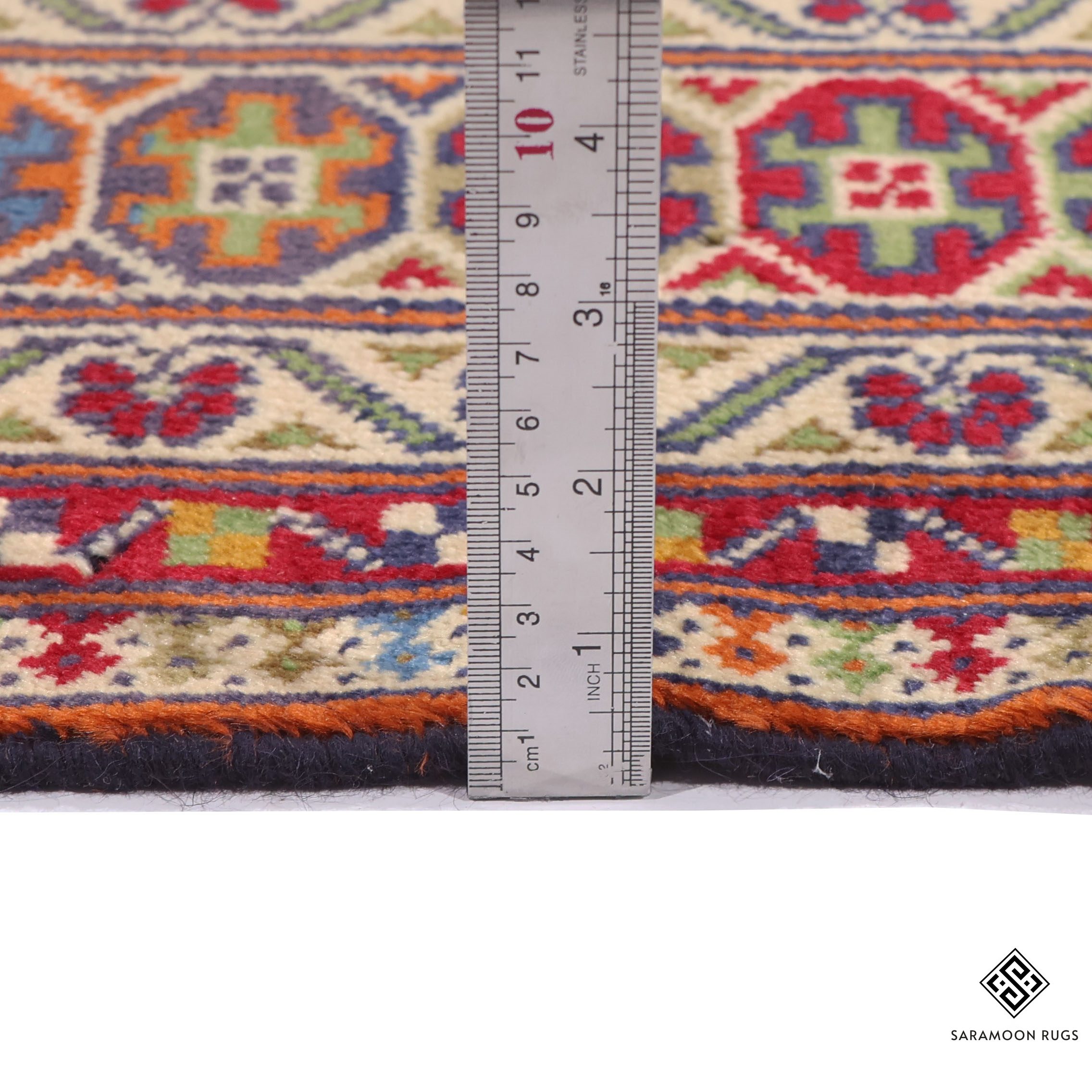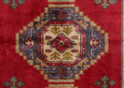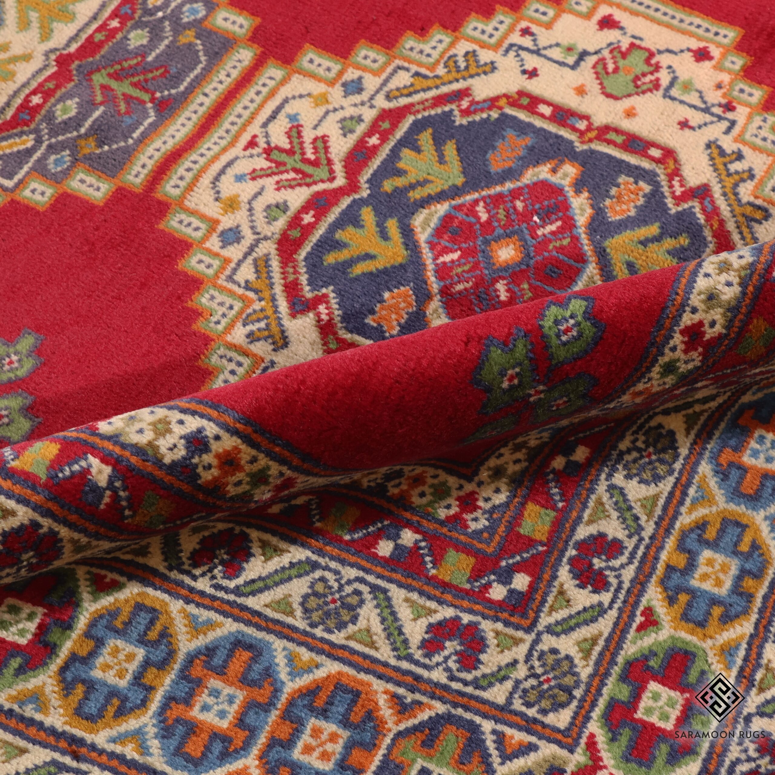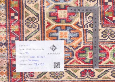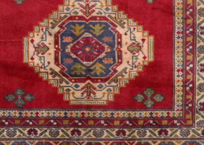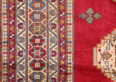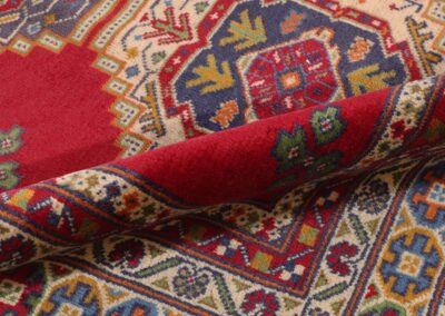The pile material is 100% natural fine wool and the foundation is made of natural cotton, ensuring both durability and a luxurious feel underfoot. The natural materials also contribute to the rug’s rich, saturated colors and subtle variations in tone that give it depth and character.