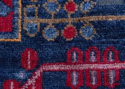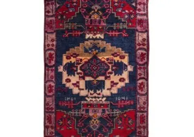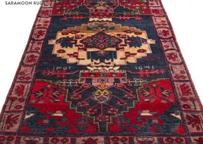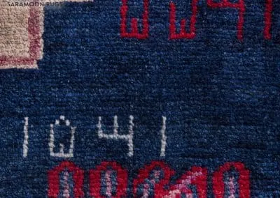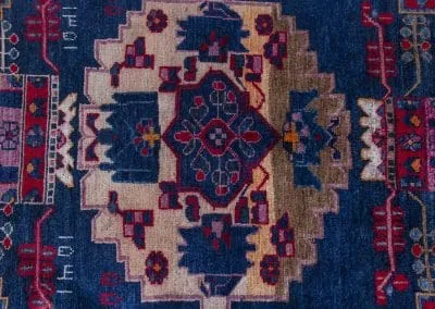 This handmade rug is not just a floor covering, but a piece of history, with a date marking its creation 50 years ago. It features a striking navy blue field bordered by rich reds and detailed with beige accents. The traditional patterns and medallion design showcase its heritage craftsmanship. Durable and vibrant, this woolen rug carries the legacy of its era, making it a timeless treasure for any home.