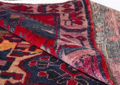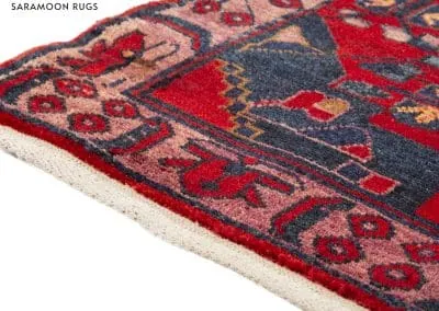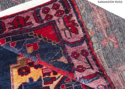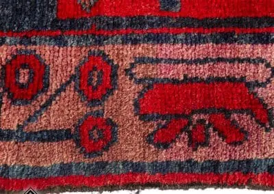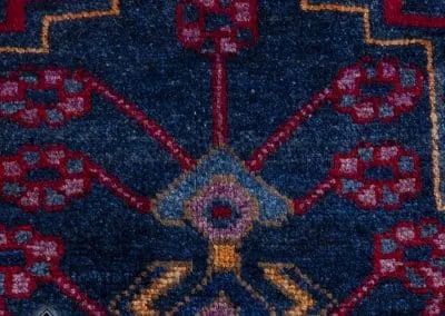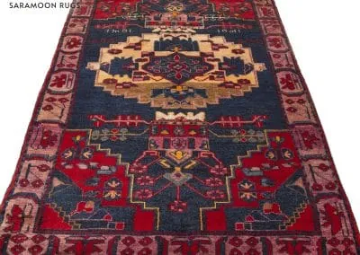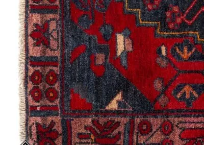 Vintage hand-knotted Lori tribal rug with navy blue field, red borders, and traditional medallion design. Pure wool pile on cotton foundation with authentic 50-year patina.