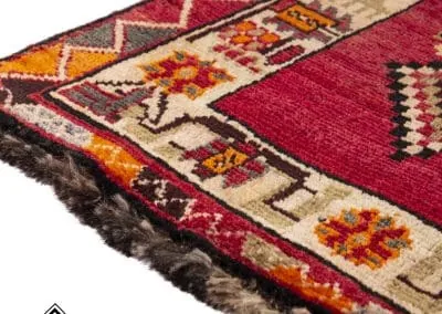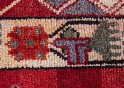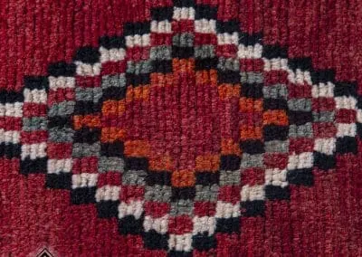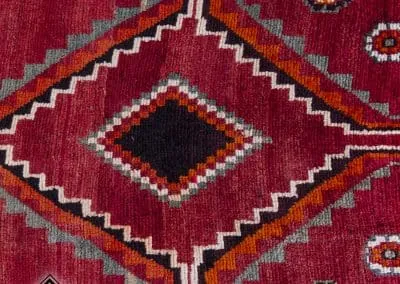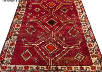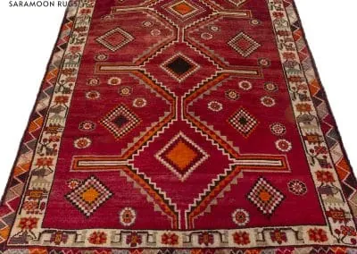 This one-of-a-kind handmade Shiraz Tribal rug is a standout piece, boasting a bold and vibrant red field. It’s adorned with geometric diamond patterns in a striking arrangement, featuring contrasting hues of deep black, earthy browns, and pops of creamy beige. The unique design is framed by an intricate border, showcasing a variety of smaller geometric motifs that add to its rich visual texture.