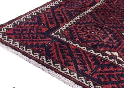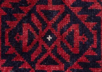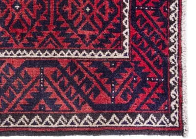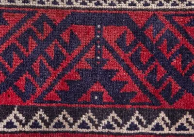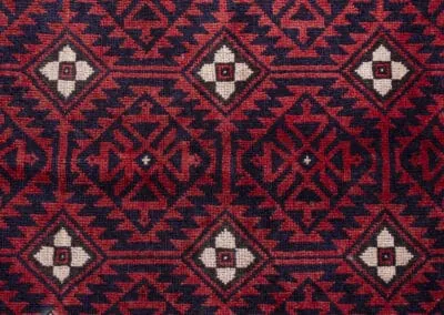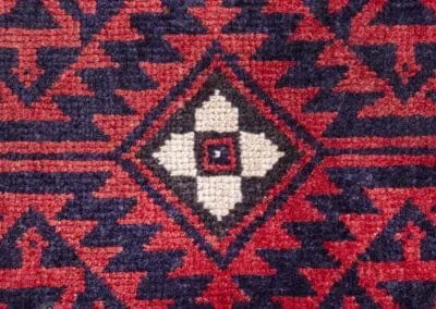 This exquisite vintage Balooch rug is a testament to the skilled craftsmanship and artistic heritage. Featuring a striking geometric pattern, this rug boasts an intricate design of repeating diamond motifs in rich shades of red and black, accented with subtle touches of white. The bold border frames the central design, enhancing its visual appeal and adding a sense of balance.