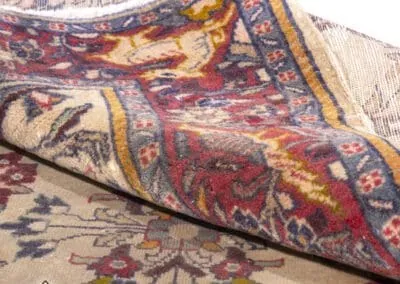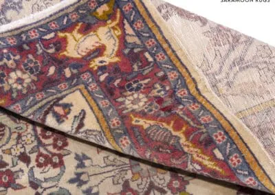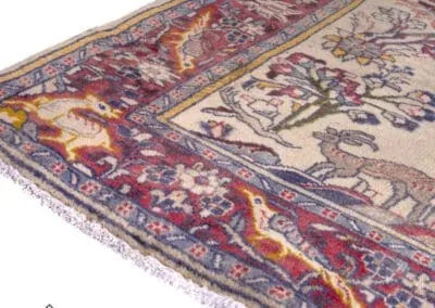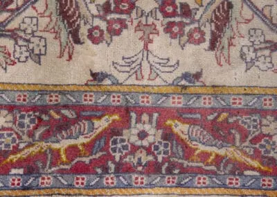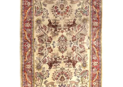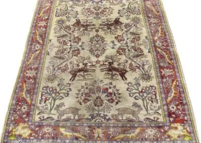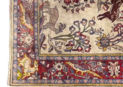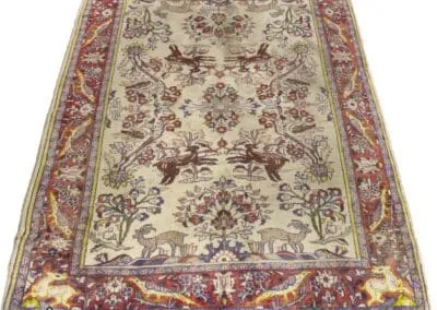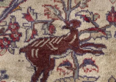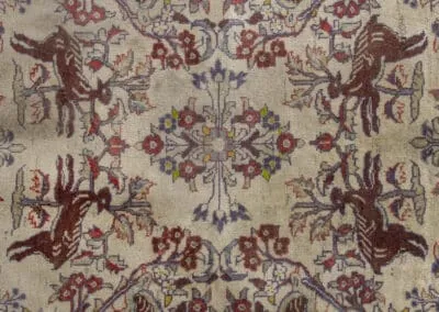 The vintage Sarouq rug is a captivating masterpiece originating from the Arak region. Its intricate patterns and rich colouring make it a true work of art. The central field features a dense floral and deer’s motif against a cream background. Surrounding the central design, detailed borders showcase repeating floral elements and serrated leaf patterns, adding depth and elegance to the rug. The warm color palette, including deep reds, blues, and creams, creates a sense of coziness and sophistication. Green accents enhance the overall harmony of the composition.