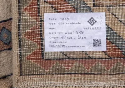 The border showcases a zigzag pattern, framing the central design and adding to the rug’s visual appeal. The rug’s coarse weave and abstract designs reflect the bold, primitive style typical of Gabbeh rugs.