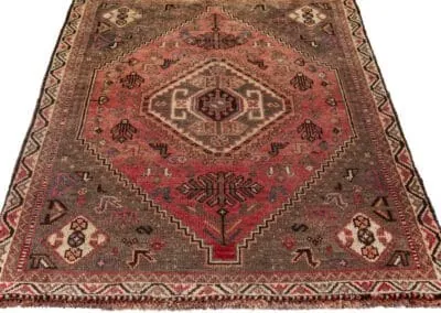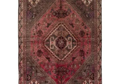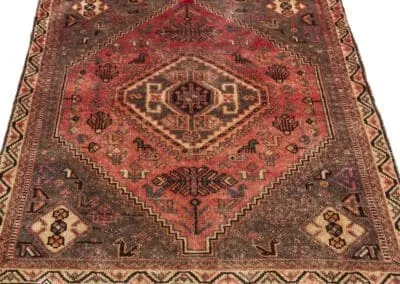 Step into the world of Persian rugs artistry with our vintage Shiraz rug. The rug’s central medallion is a focal point, surrounded by an array of intricate geometric patterns and motifs. Four additional medallions are strategically placed, adding balance and depth to the design.