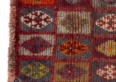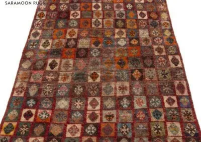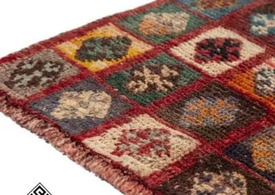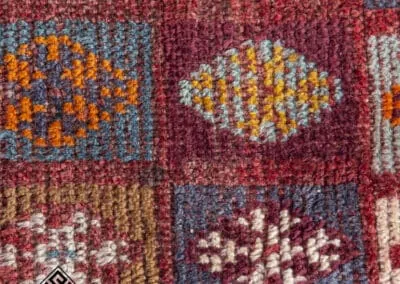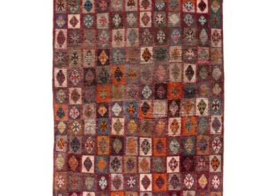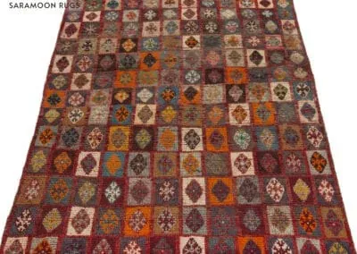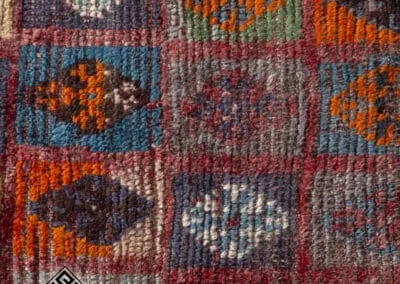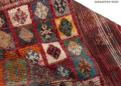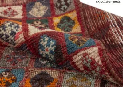 Embrace the rich heritage of Persian craftsmanship with this vintage Shiraz rug. Uniquely designed with a patchwork pattern, the rug is adorned with squares and rectangles, each exhibiting distinct patterns. The color palette is a vibrant mix of deep reds, blues, oranges, and browns.