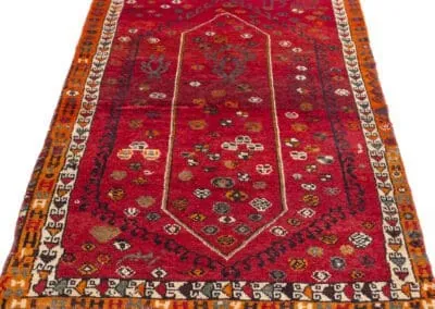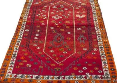 Vintage hand-knotted Shiraz rug with vibrant red field and geometric tribal patterns. Soft high-pile 100% wool construction with bold orange border.