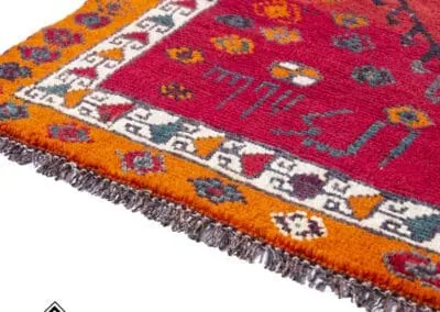 The bright red background is decorated with traditional floral and geometric patterns, showcasing the rich history and skill of Shiraz rug-making. The bold orange and white border adds a striking contrast, making the design stand out.