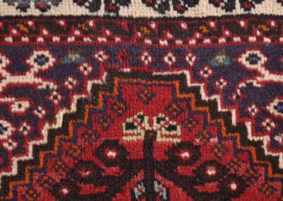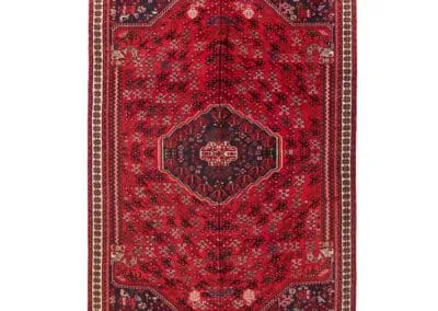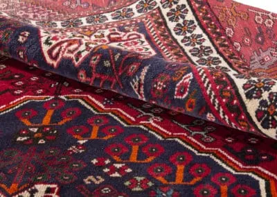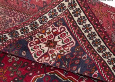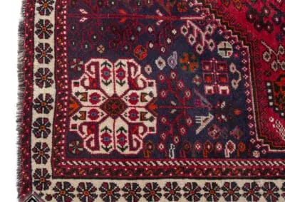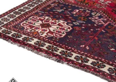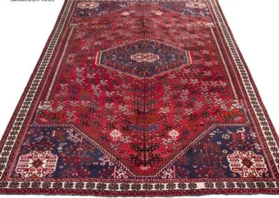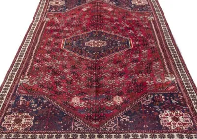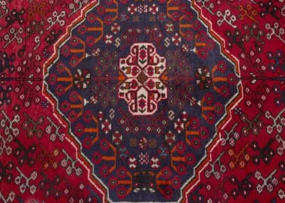 Vintage hand-knotted Shiraz rug showcasing geometric patterns and a striking medallion in vibrant red, blue, and ivory. Premium wool pile with traditional tribal character.