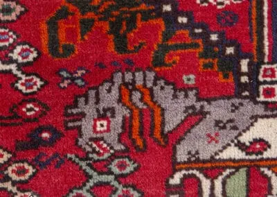 Ideal for a living room, dining area, or bedroom, this Shiraz rug adds a touch of history and cultural richness to your home. Its robust construction makes it suitable for high-traffic areas, ensuring it will be a cherished piece for years to come. Bring a piece of Persian heritage into your home with this exquisite vintage Shiraz rug.