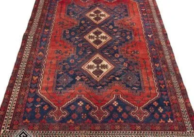 Vintage hand-knotted Sirjan rug featuring geometric medallion design in deep blue and rich red tones. Fine wool pile on cotton foundation with authentic tribal character.