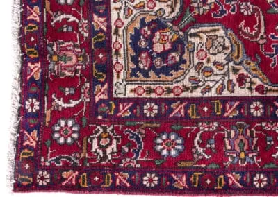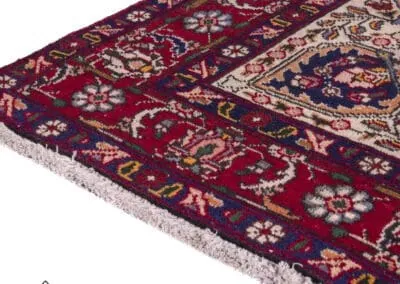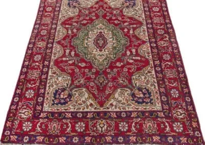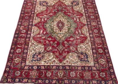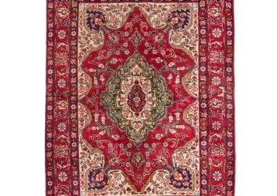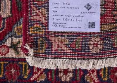 The central medallion, adorned with detailed motifs, showcases the skilled craftsmanship characteristic of Tabriz rugs. Surrounding the medallion, the border features an array of complementary colors and patterns, creating a harmonious and visually appealing design.