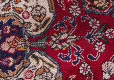 Presenting an exquisite vintage Tabriz rug, renowned for its durability and perfect for enhancing the ambiance of shops and businesses. This rug boasts a vibrant and rich color palette, dominated by a striking red field that is beautifully accented with intricate floral and geometric patterns.