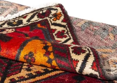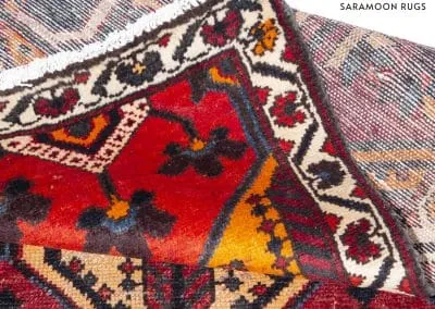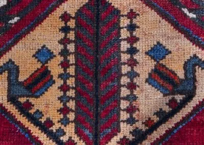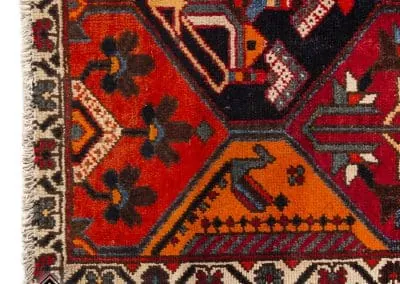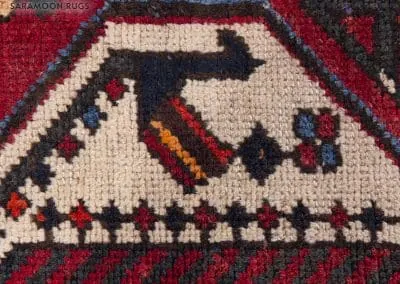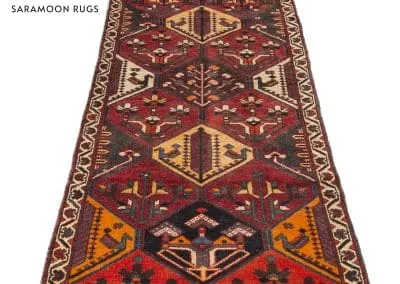 The rug is divided into panels, each featuring a unique, symmetrical design that draws the eye along its length. The intricate borders that run the perimeter of the rug are adorned with delicate motifs that complement the central design’s boldness.