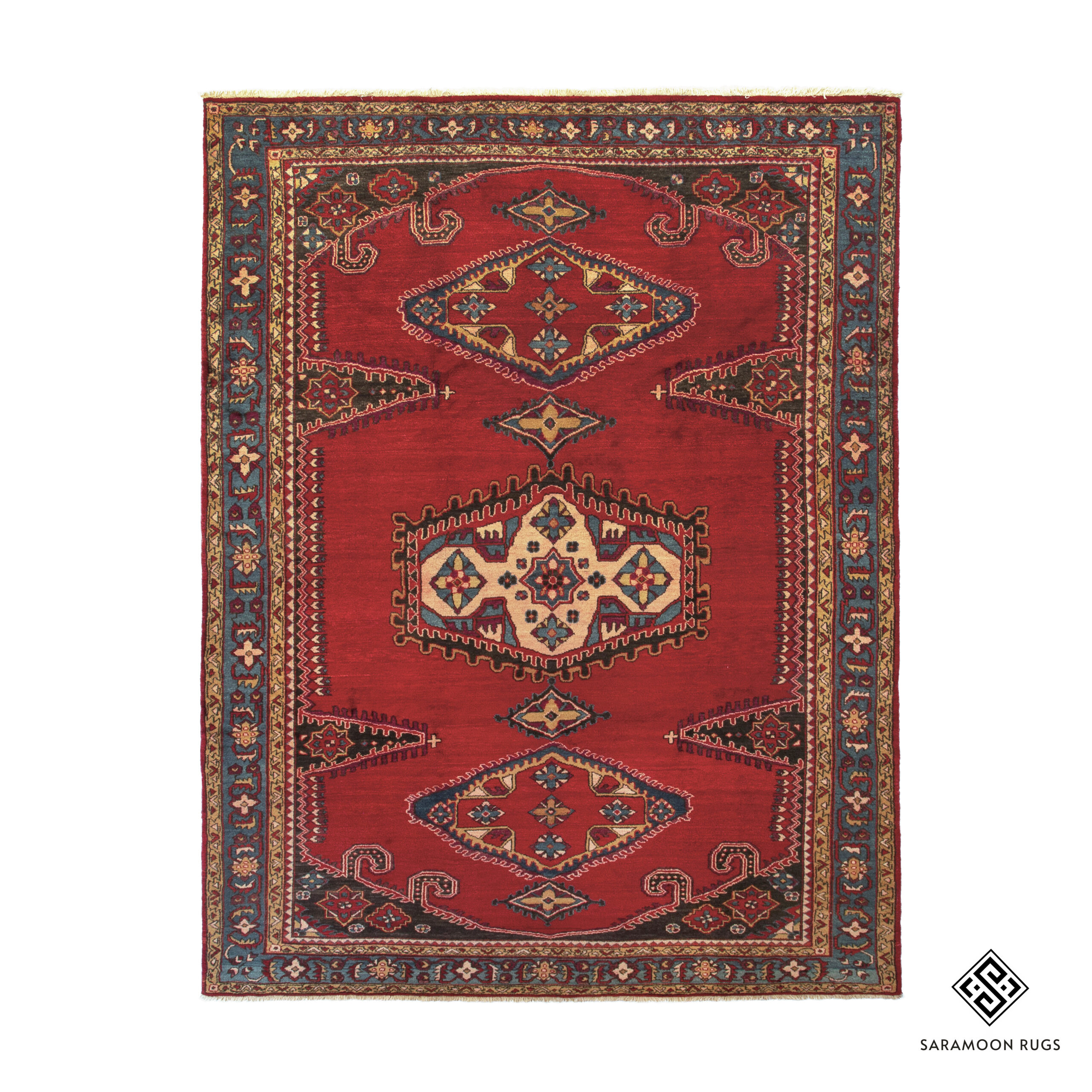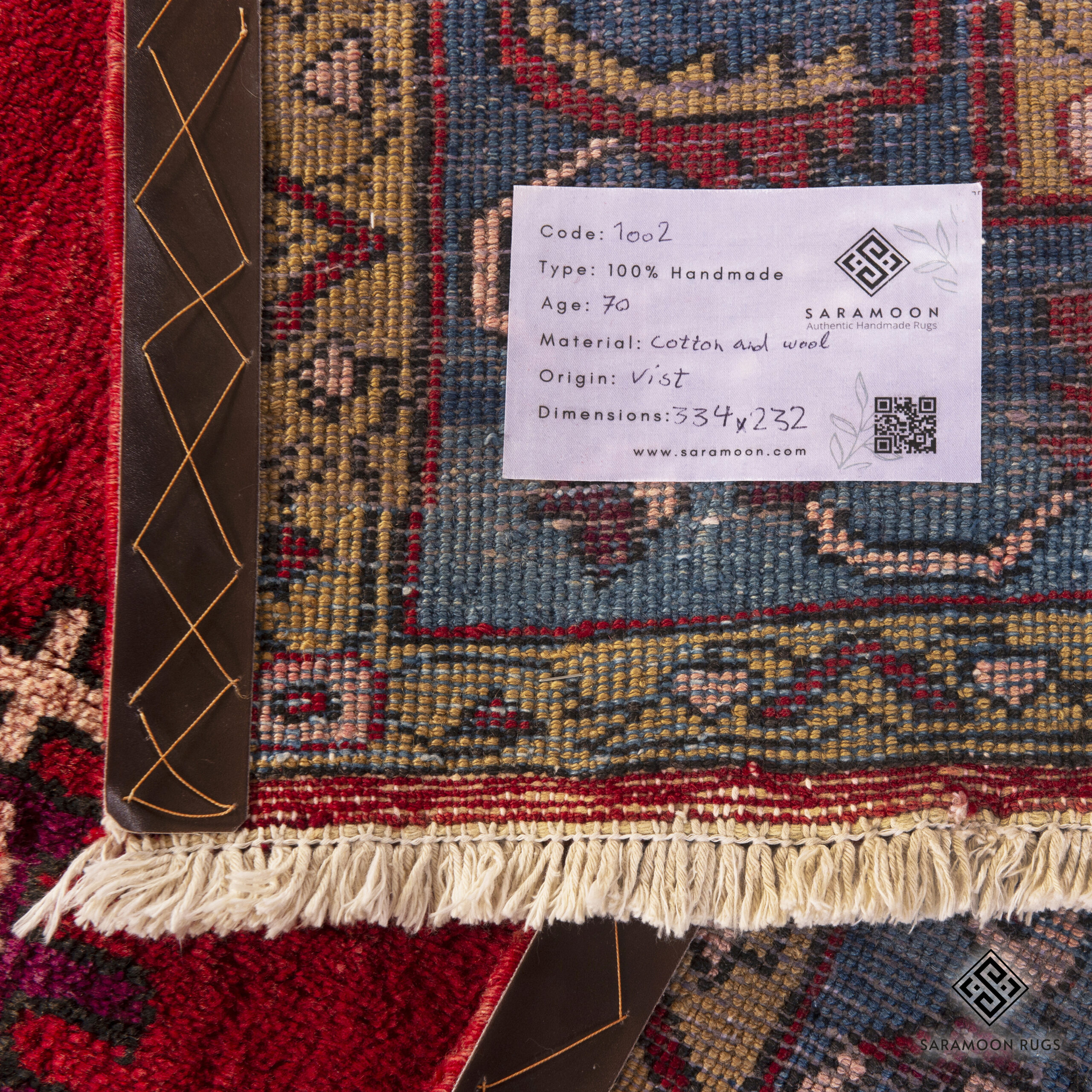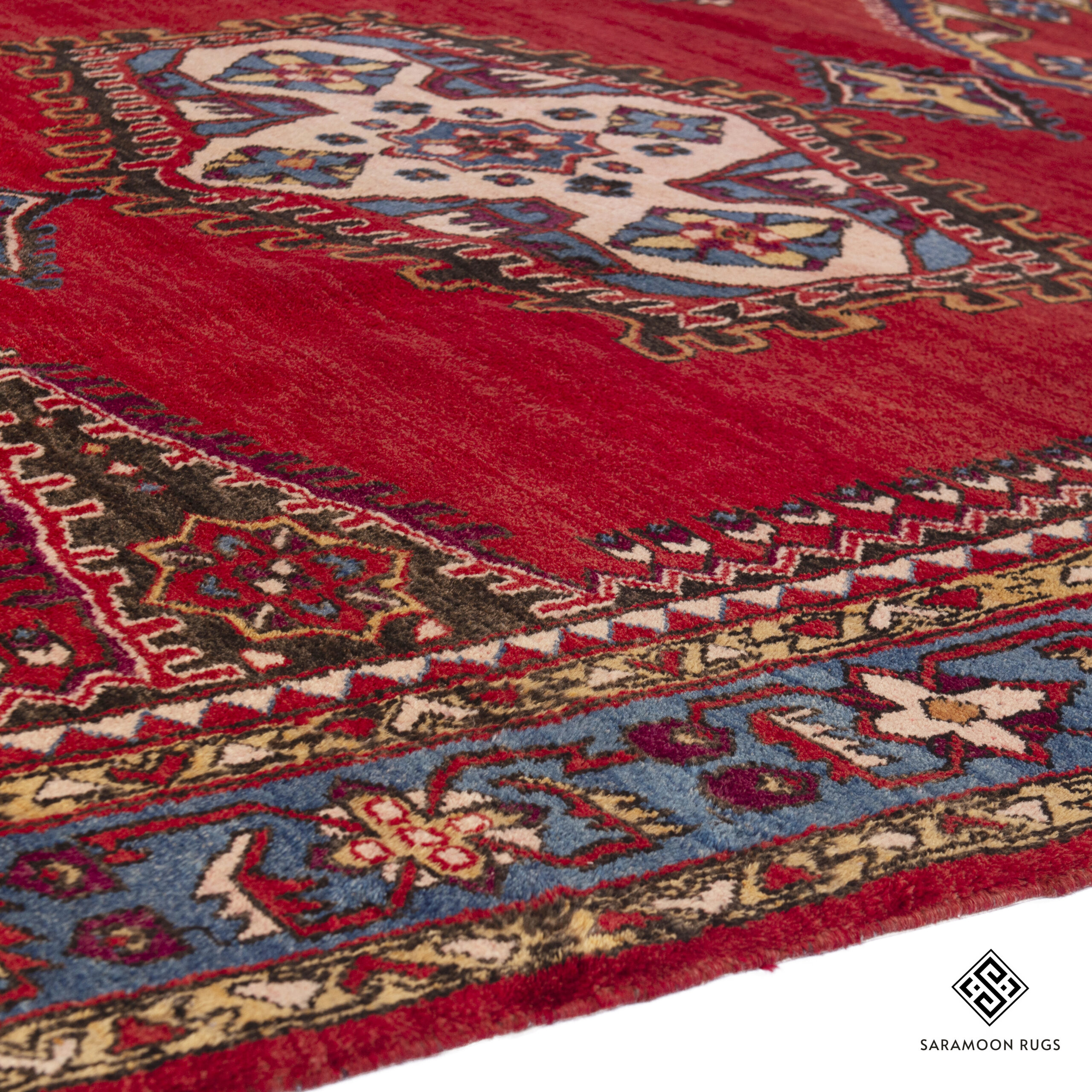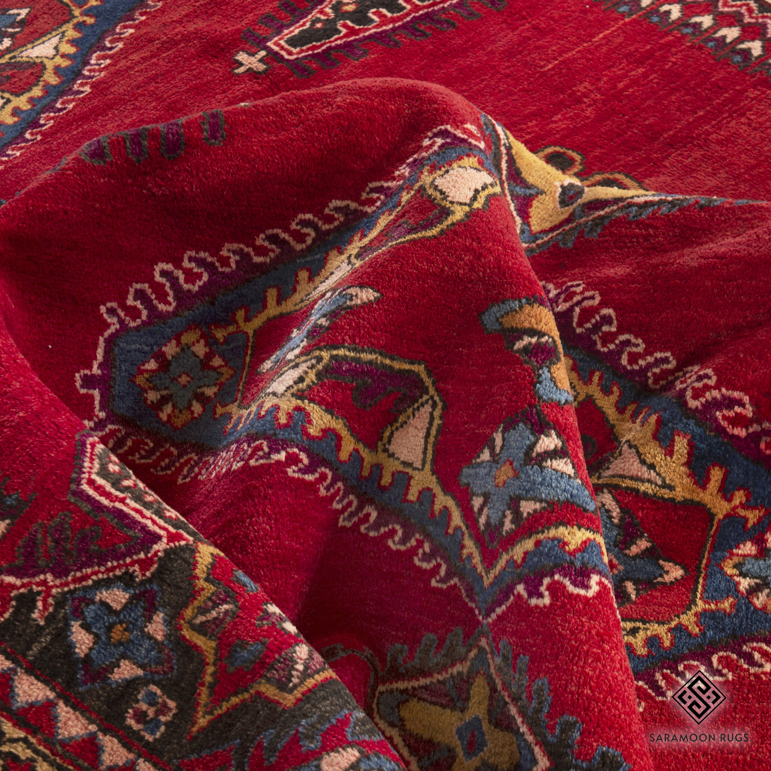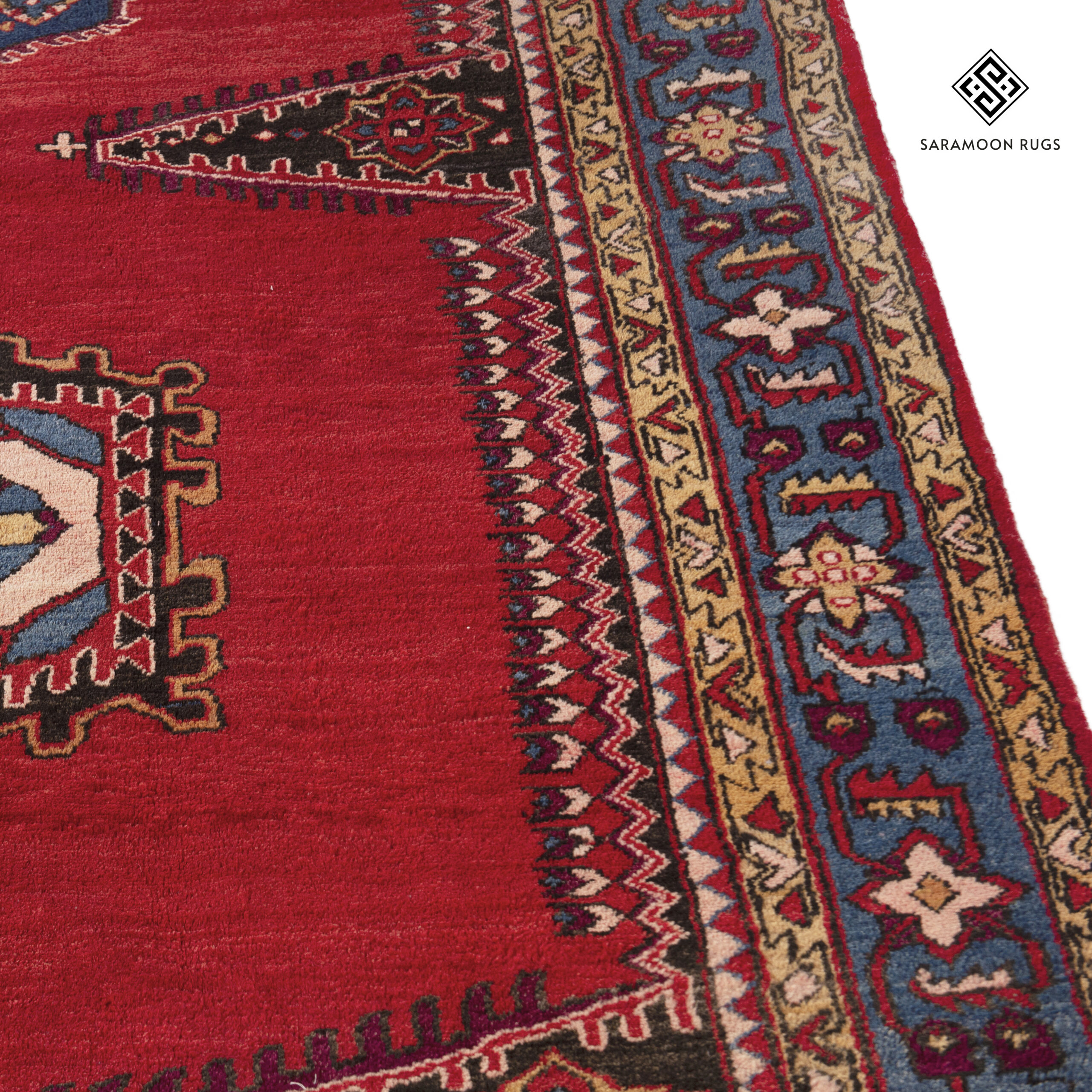 This stunning vintage Viss rug commands attention with its magnificent crimson field, a rich, warm red that has deepened beautifully over the decades. The piece exemplifies the bold, tribal aesthetic characteristic of the Viss weaving tradition, presenting a captivating composition that balances geometric precision with organic, nomadic charm. Framed by a distinguished steel-blue border adorned with traditional floral motifs, this rug radiates both strength and sophistication, making it an exceptional centerpiece for discerning collectors.
