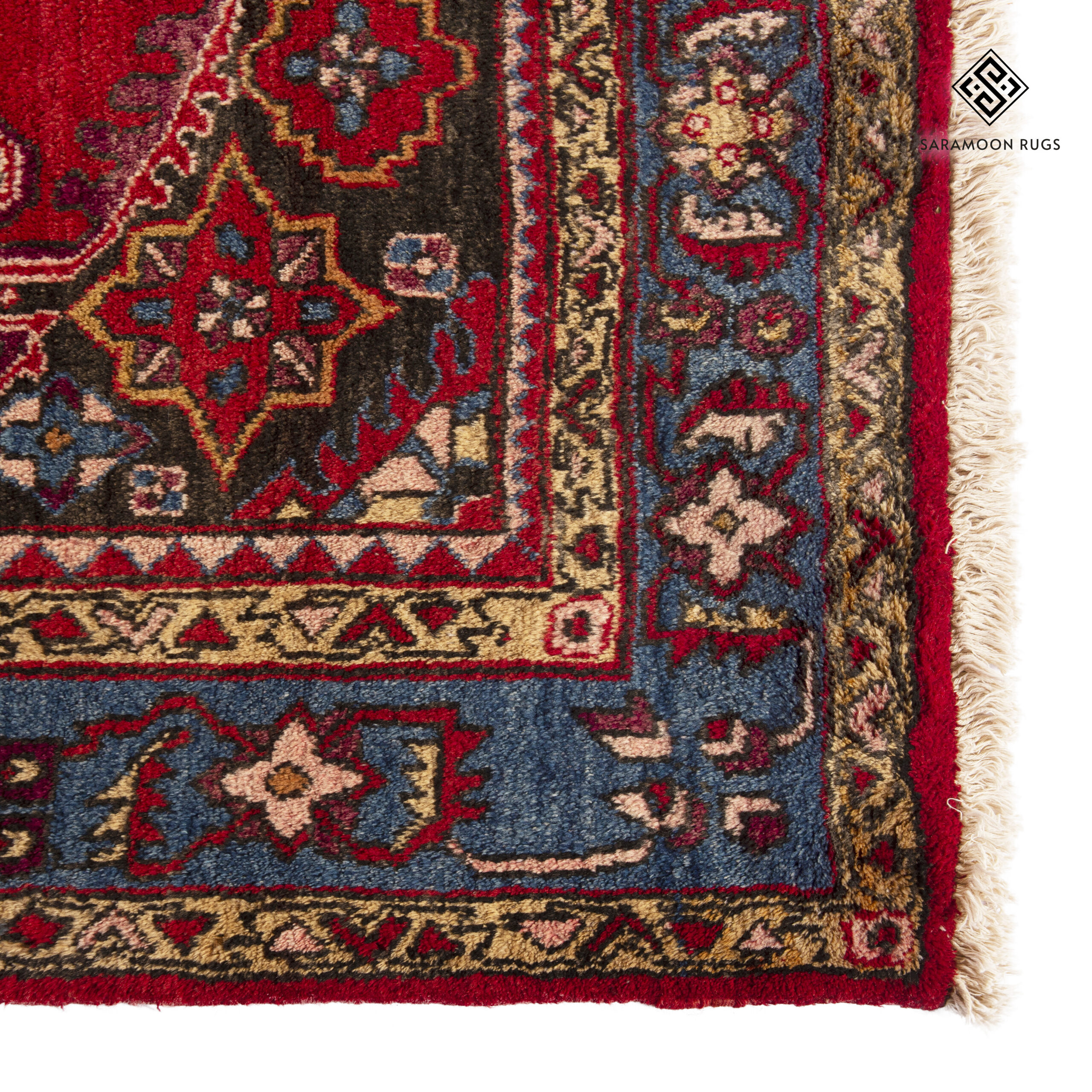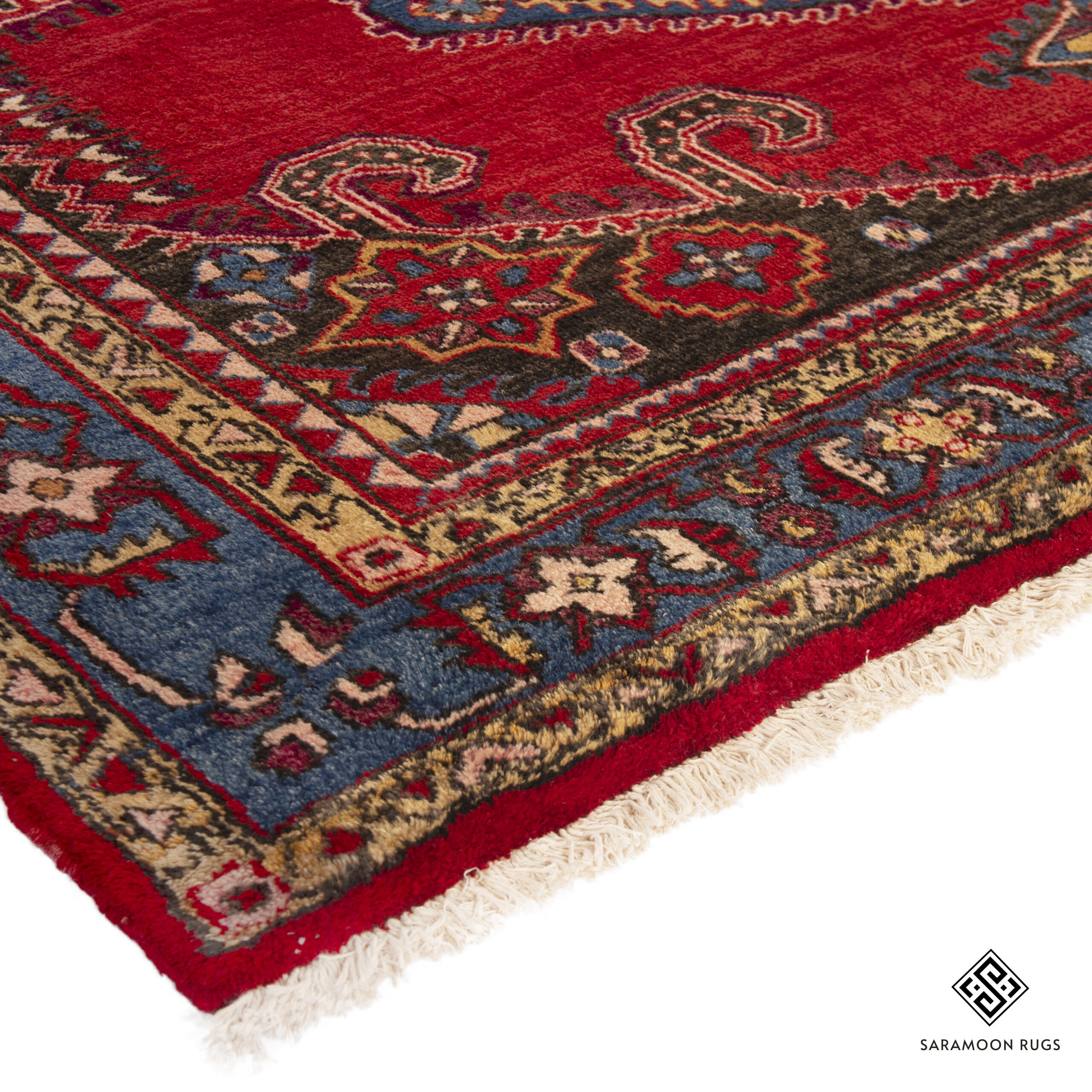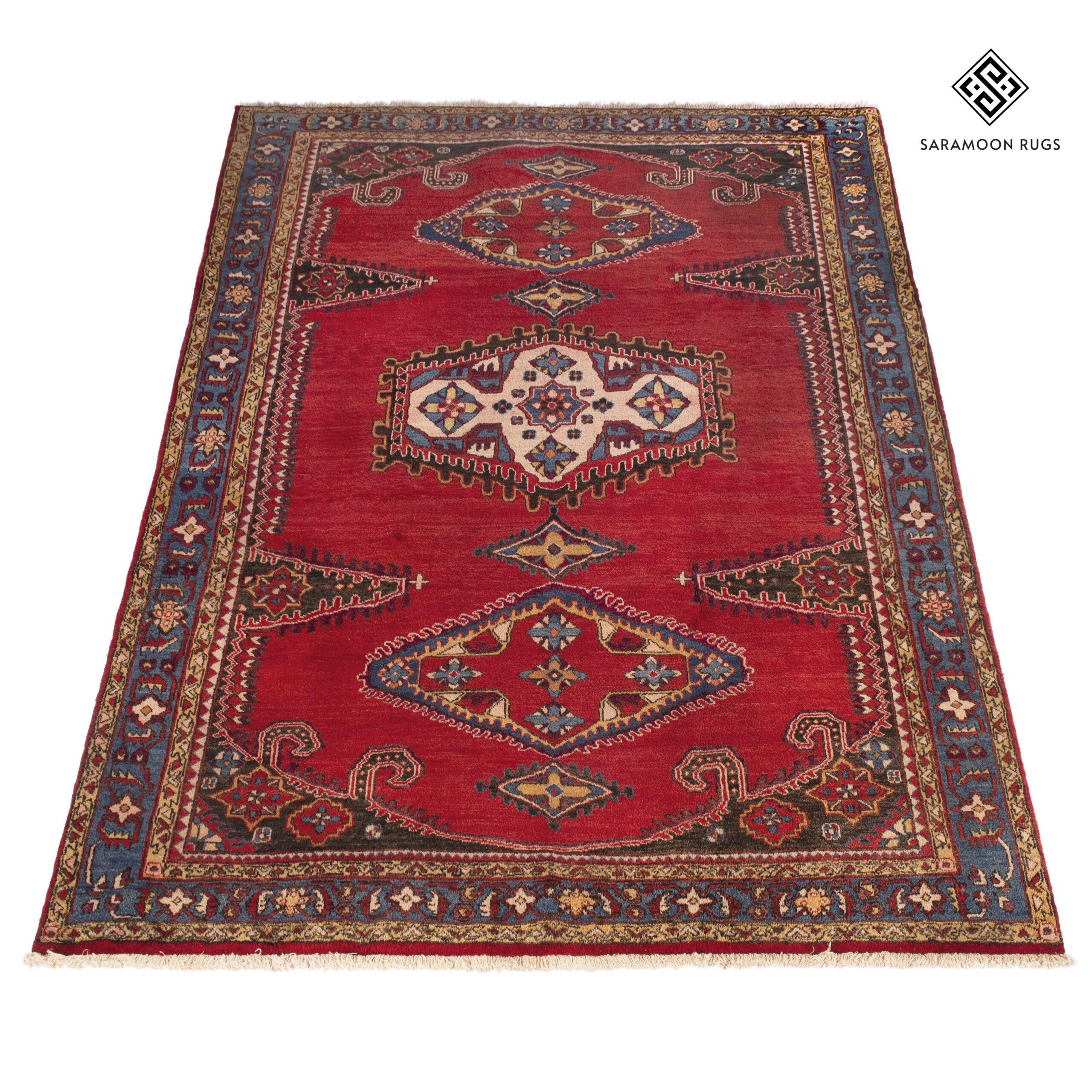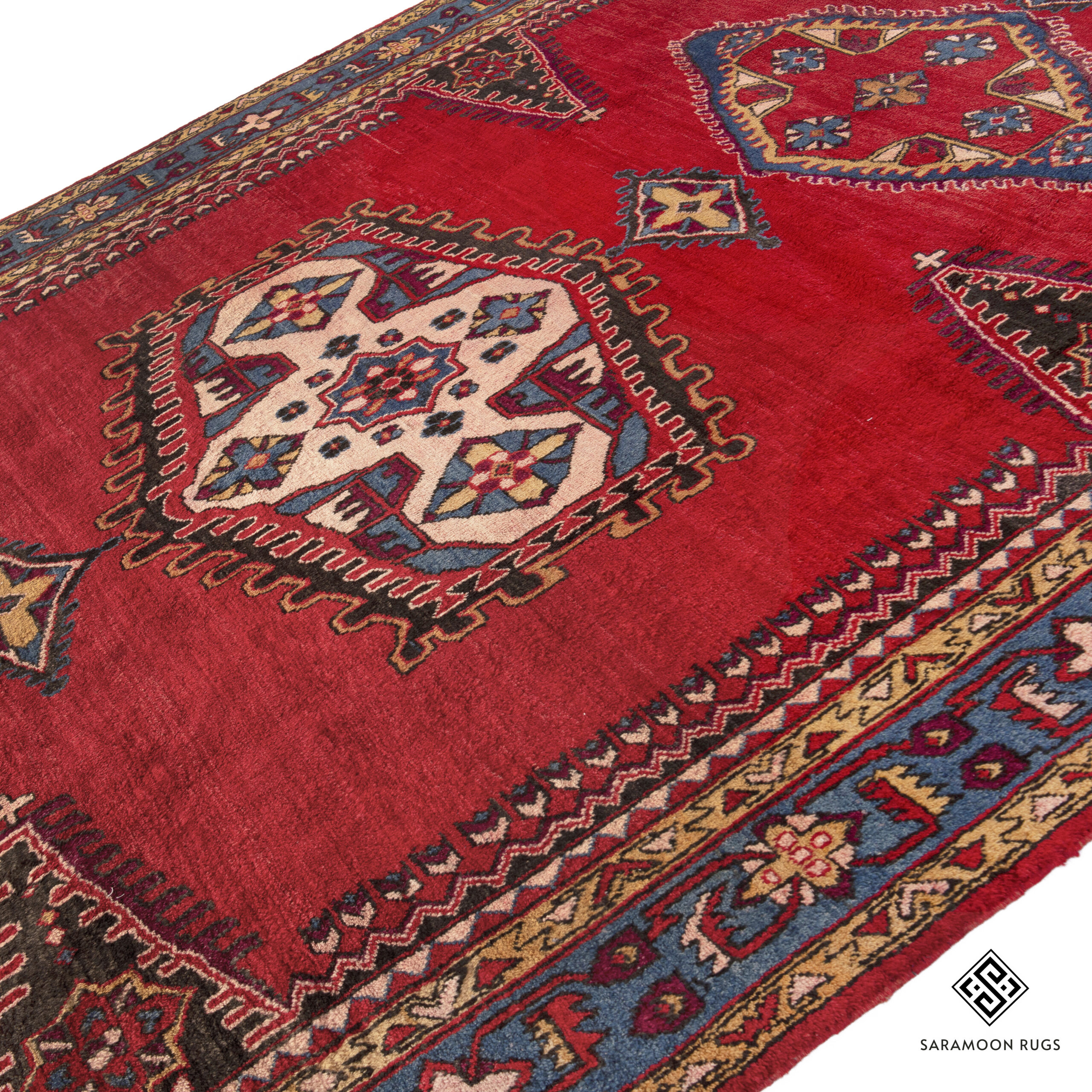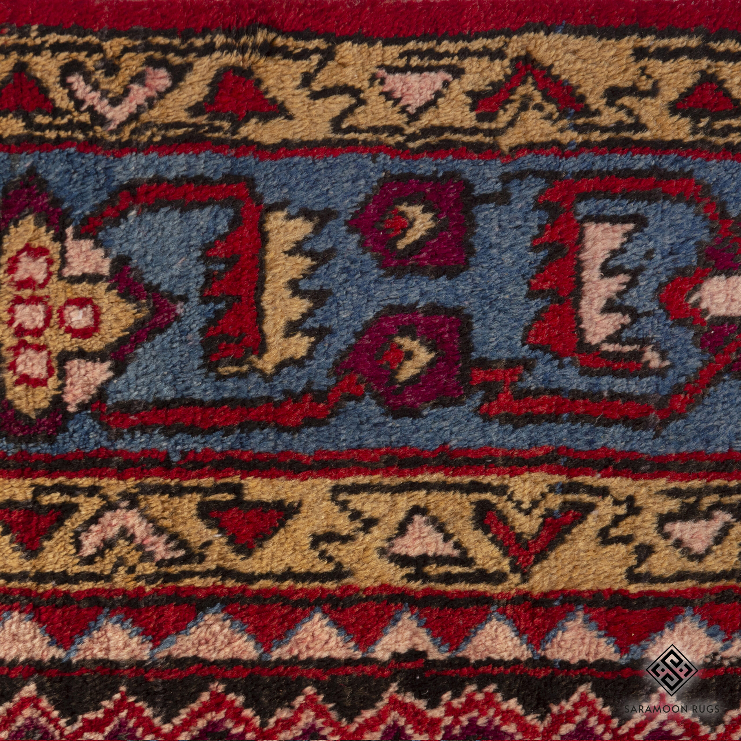 This stunning vintage Viss rug commands attention with its magnificent crimson field, a rich, warm red that has deepened beautifully over the decades. The piece exemplifies the bold, tribal aesthetic characteristic of the Viss weaving tradition, presenting a captivating composition that balances geometric precision with organic, nomadic charm. Framed by a distinguished steel-blue border adorned with traditional floral motifs, this rug radiates both strength and sophistication, making it an exceptional centerpiece for discerning collectors.