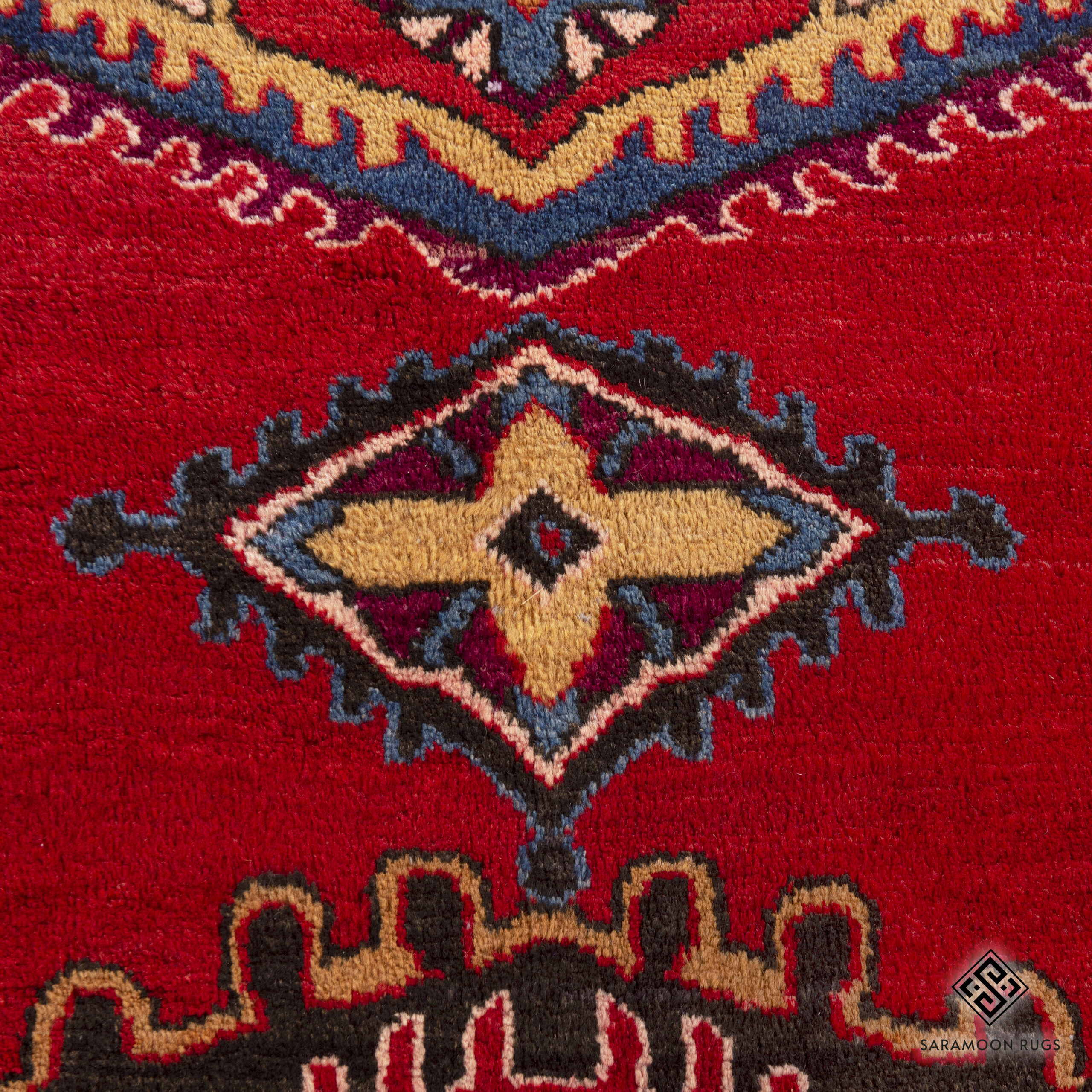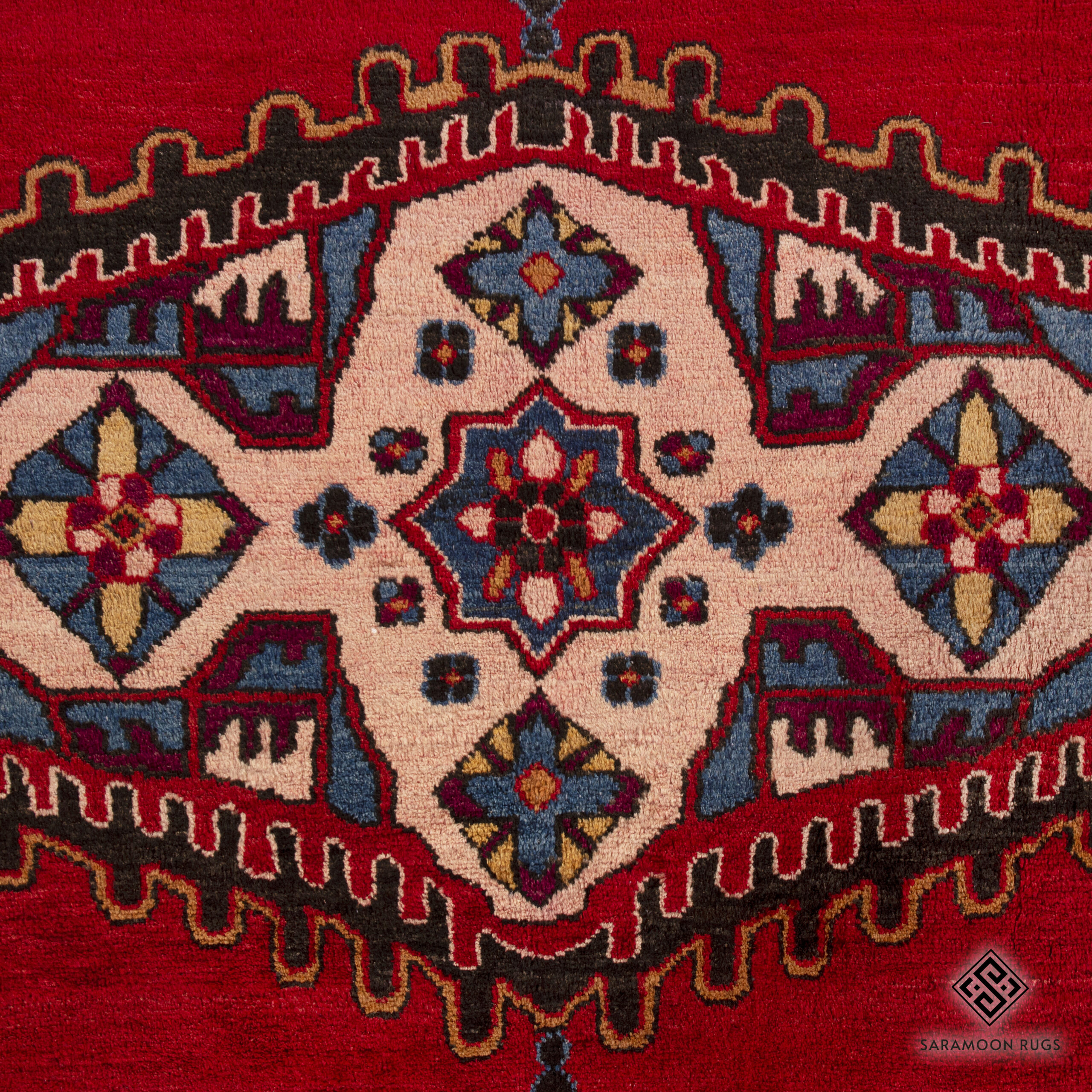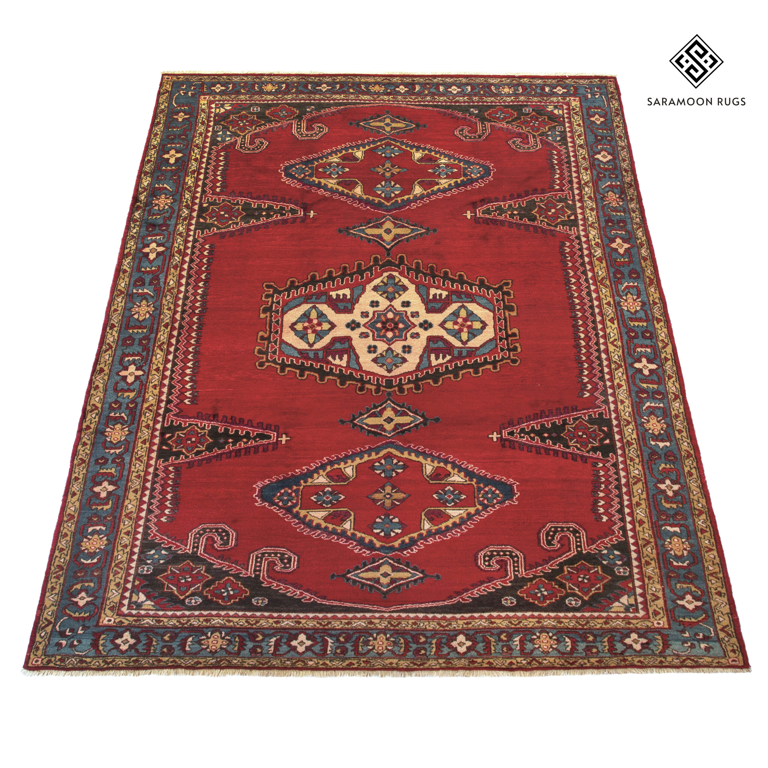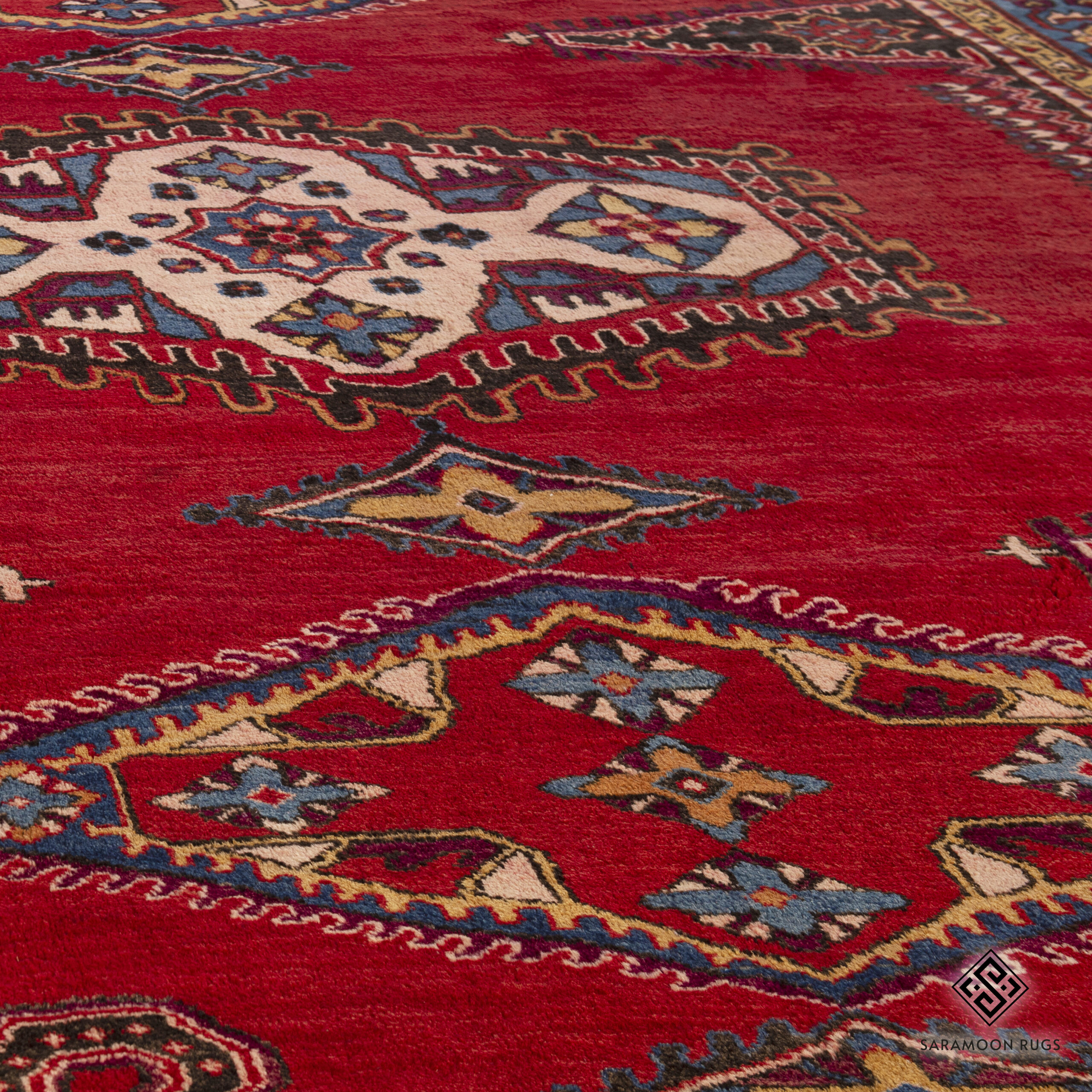 The design showcases three prominent hexagonal medallions arranged vertically along the cardinal axis, each rendered in varying shades of cream, gold, and navy blue. These striking medallions feature intricate geometric patterns and delicate cross motifs that speak to ancient symbolic traditions. The surrounding field is animated by smaller diamond-shaped motifs in golden yellow and turquoise, while serrated-edge triangular elements emerge from the corners, creating a dynamic interplay of forms. The distinctive “crenellated” or castle-like borders encircling each medallion display the characteristic jagged edges that define tribal Persian weaving. The color palette harmoniously combines the dominant crimson with accents of steel blue, golden amber, cream, turquoise, deep burgundy, and touches of coral pink—a testament to the natural dyes used in its creation.