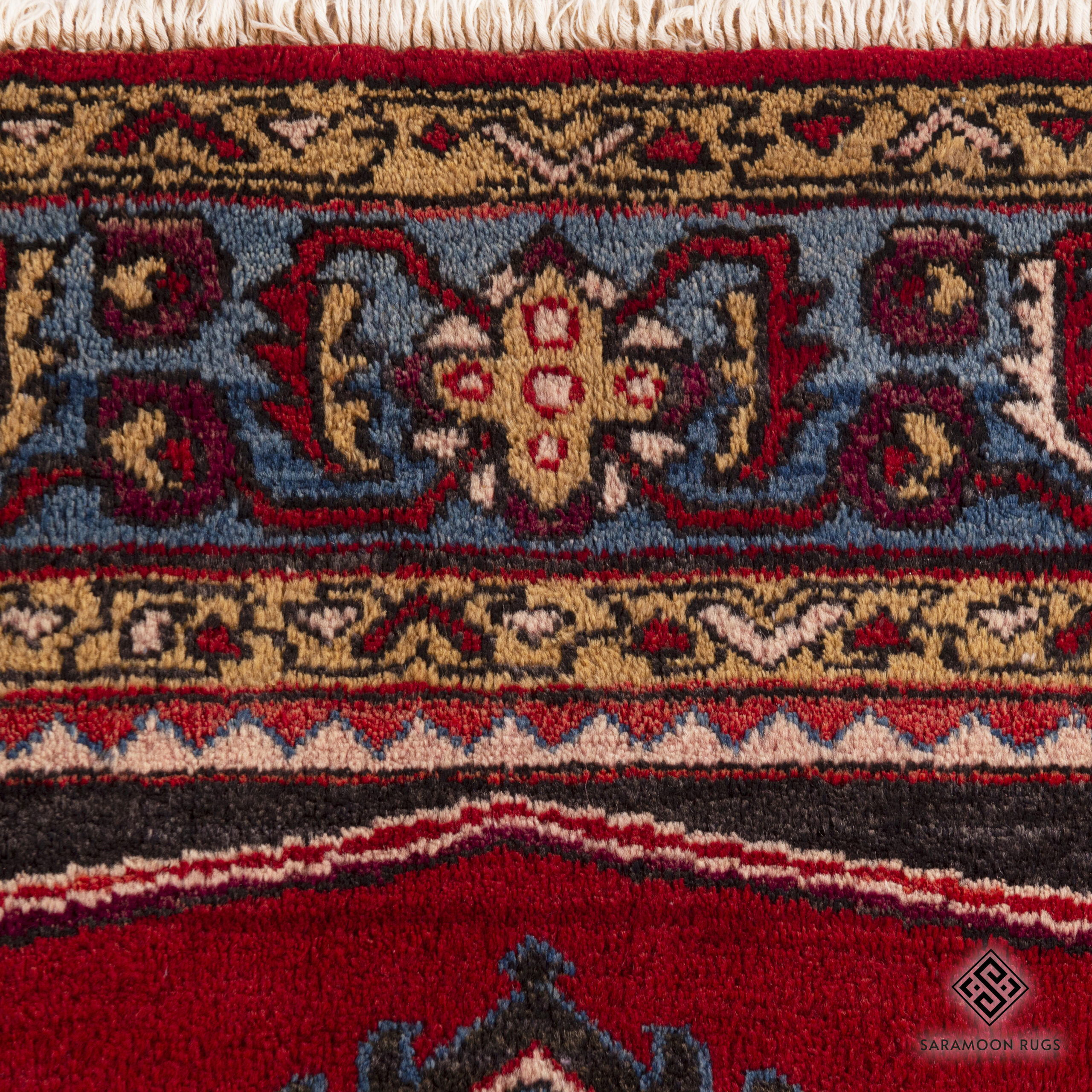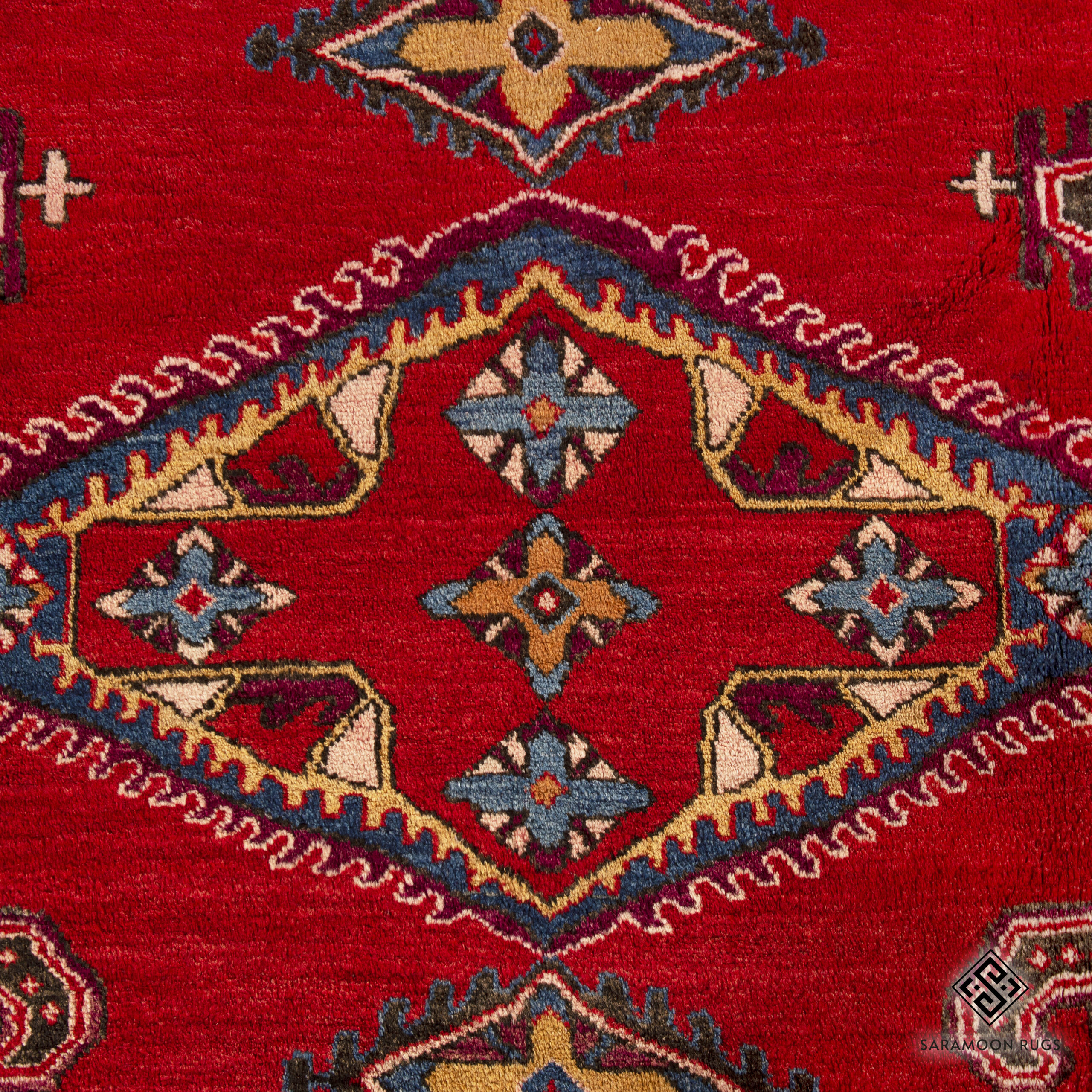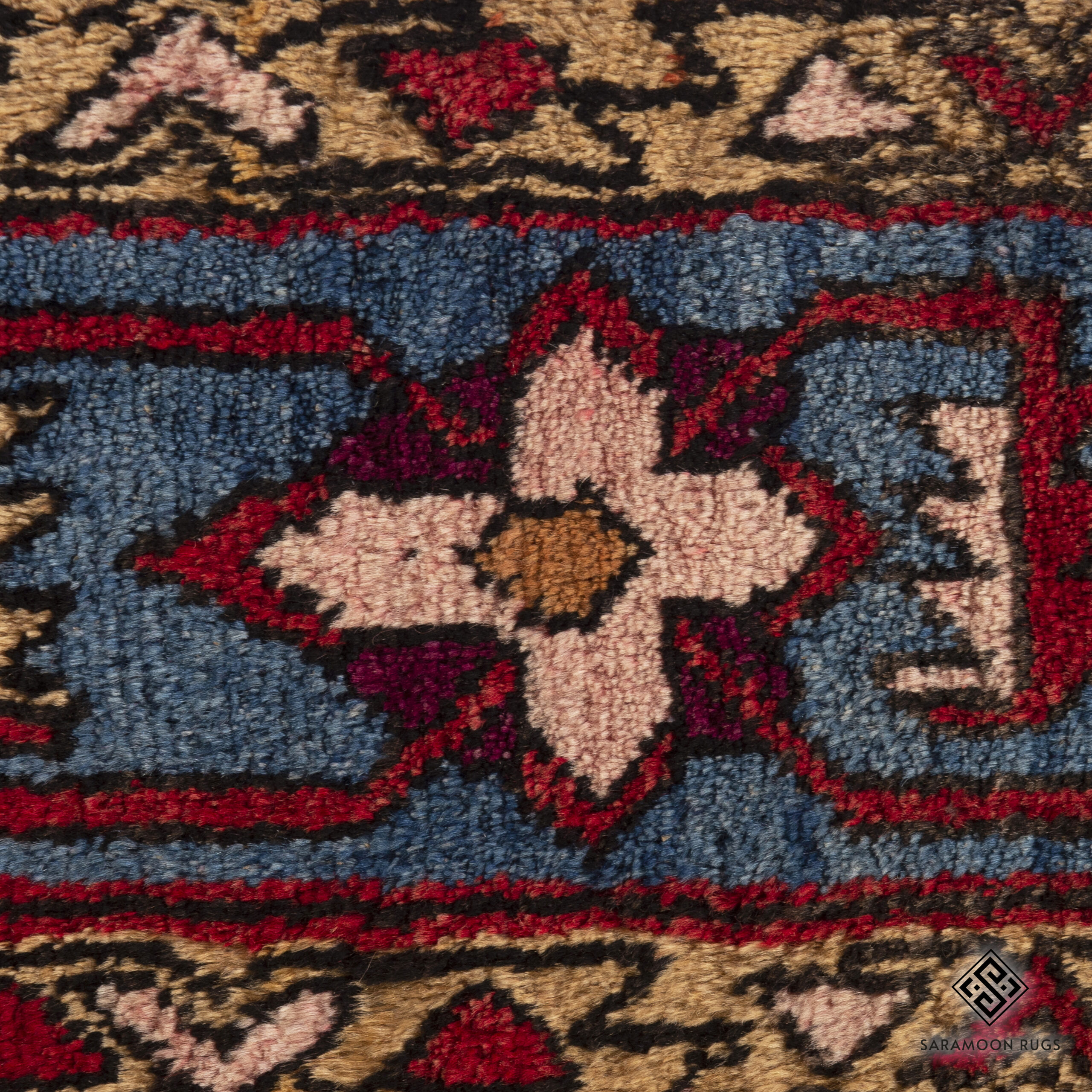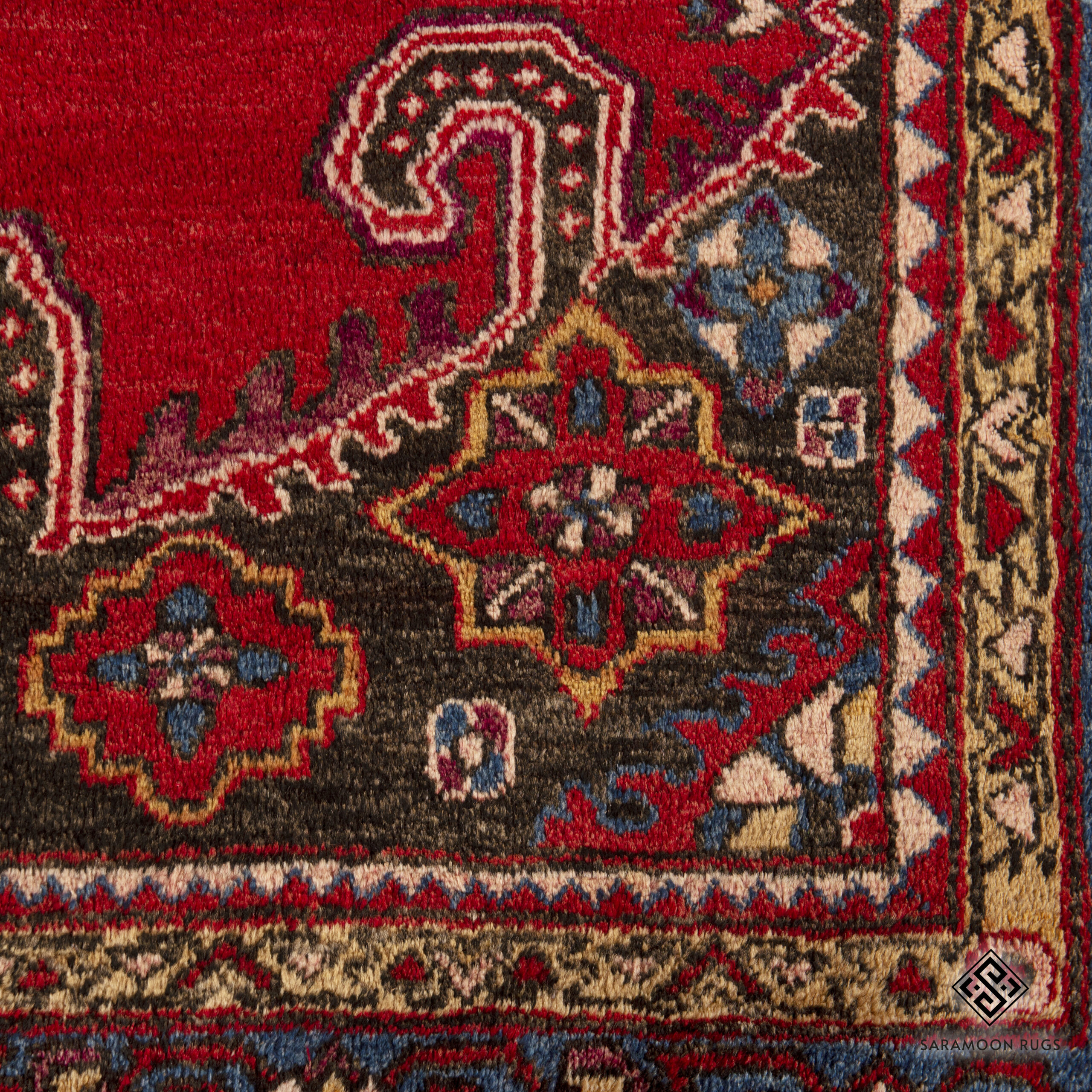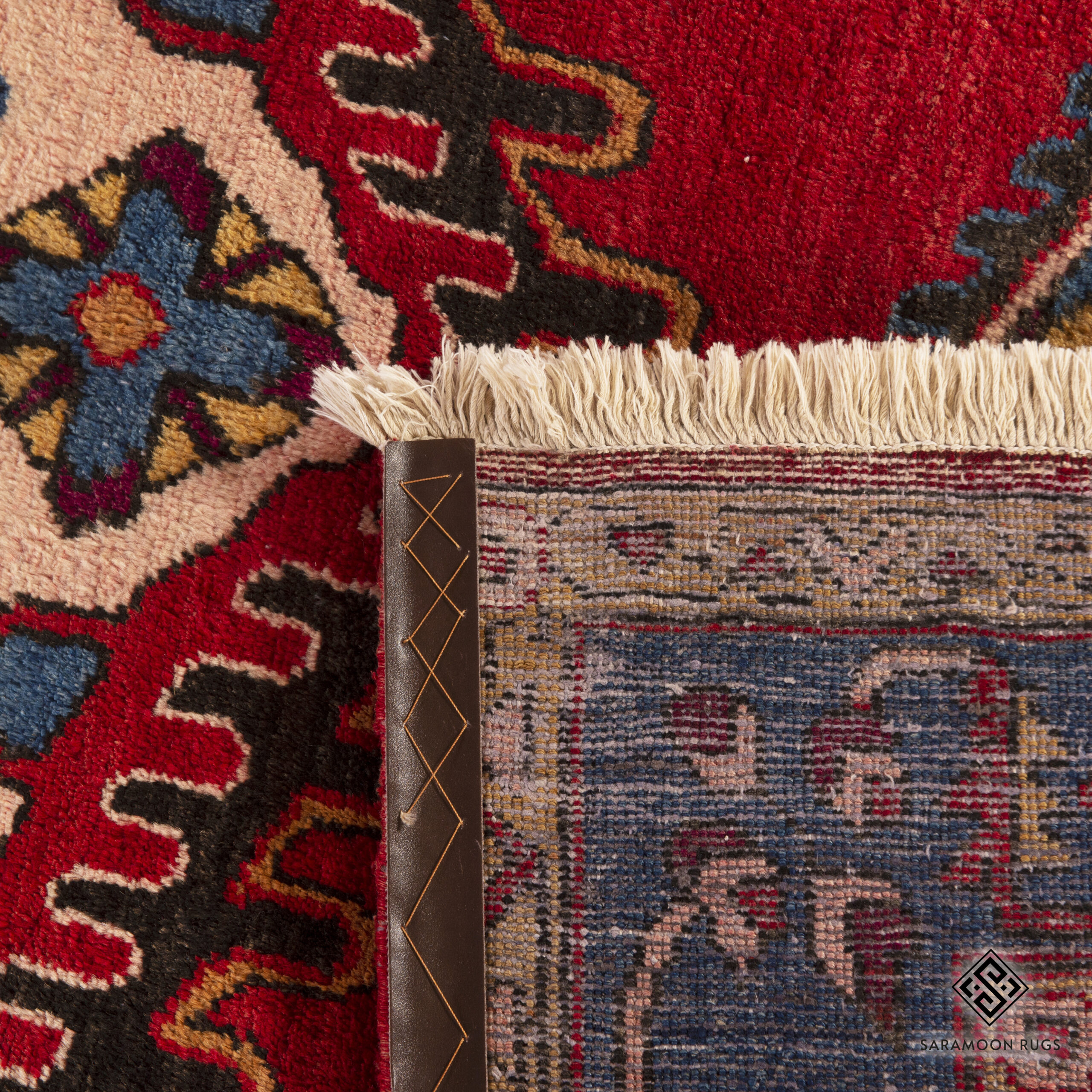 The design showcases three prominent hexagonal medallions arranged vertically along the cardinal axis, each rendered in varying shades of cream, gold, and navy blue. These striking medallions feature intricate geometric patterns and delicate cross motifs that speak to ancient symbolic traditions. The surrounding field is animated by smaller diamond-shaped motifs in golden yellow and turquoise, while serrated-edge triangular elements emerge from the corners, creating a dynamic interplay of forms. The distinctive “crenellated” or castle-like borders encircling each medallion display the characteristic jagged edges that define tribal Persian weaving. The color palette harmoniously combines the dominant crimson with accents of steel blue, golden amber, cream, turquoise, deep burgundy, and touches of coral pink—a testament to the natural dyes used in its creation.